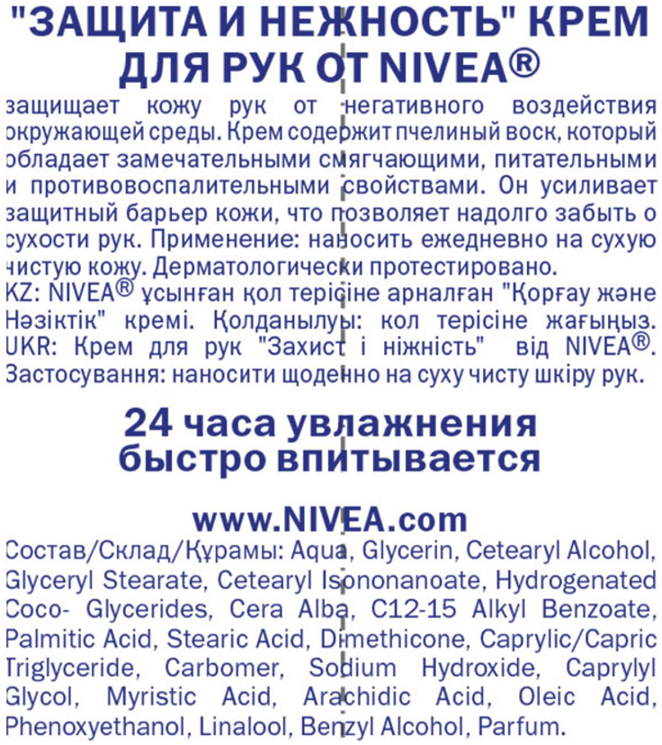NIVEA Крем для рук «Защита и нежность»+32 приятный запах быстро впитывается хорошее увлажнение не жирный смягчает