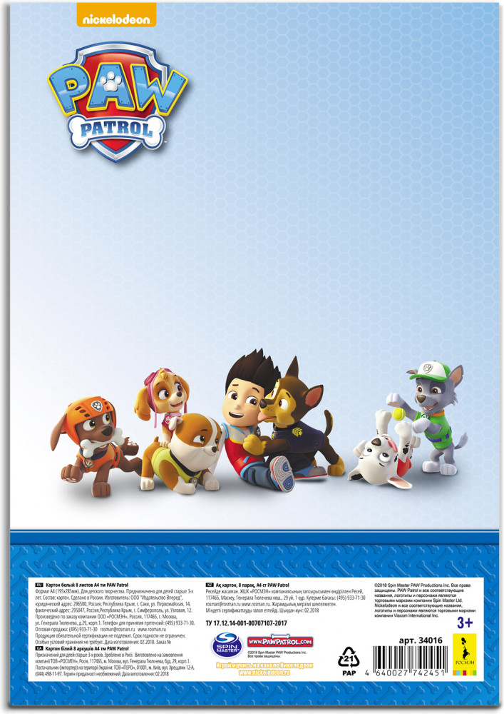 Картон белый «Щенячий патруль» (8 листов)В данный момент этот товар отсутствует в продаже. Возможно, у нас найдется аналогичный или похожий товар здесь. Серия: Щенячий патруль Белый картон «Щенячий патруль» формата А4 (28,5 х 19,5 см) - необходимый атрибут для детского творчества дома, в детском саду и начальной школе. В упаковке 8 листов мелованного картона плотностью 230 г/м2. Упаковка: папка (29,5 х 20,5 х 0,2 см) из мелованного картона с двумя клапанами, удобная для хранения картона и поделок. |