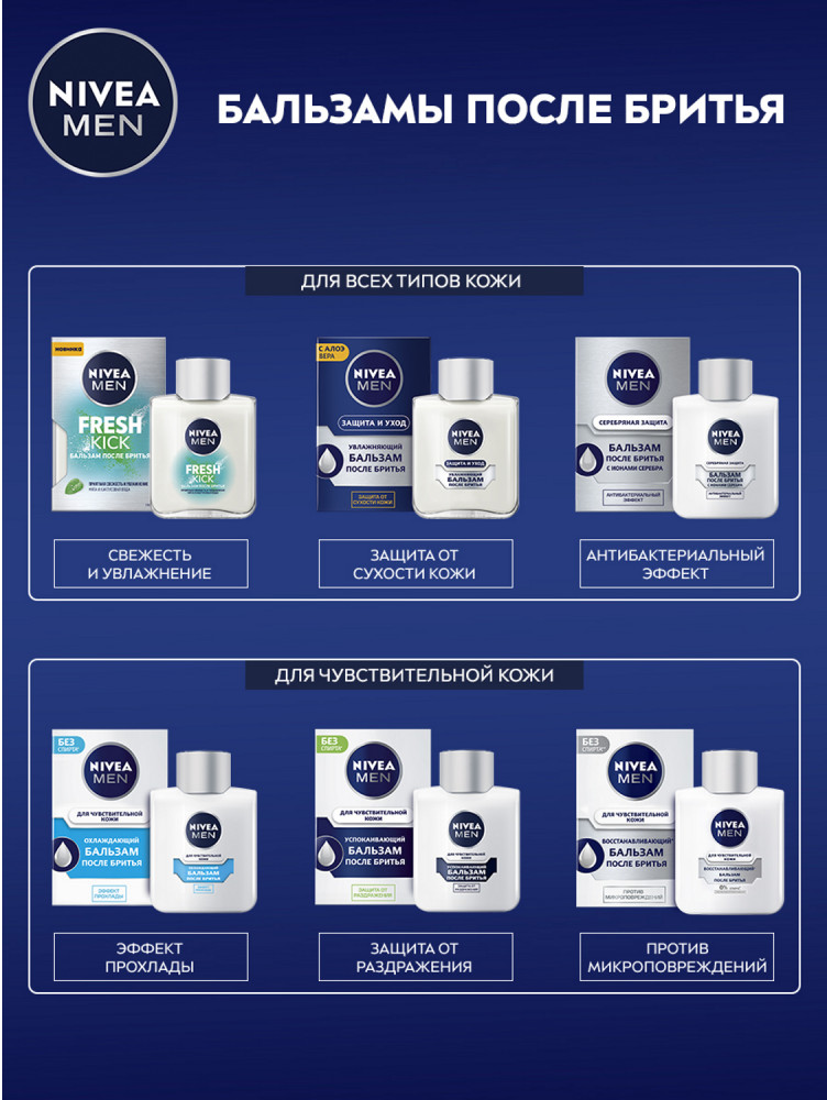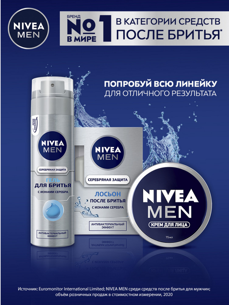 NIVEA Бальзам после бритья «Серебряная защита» с ионами серебра и антибактериальным эффектом, 100 млхорошо увлажняет В данный момент этот товар отсутствует в продаже. Возможно, у нас найдется аналогичный или похожий товар здесь. Серия: Серебряная защита Антибактериальная формула с ионами серебра эффективно борется с бактериями, вызывающими неприятный запах. Бальзам предотвращает раздражение кожи после бритья, освежает и успокаивает, быстро впитывается, не оставляя ощущения липкой пленки. Ощущение свежести надолго! |