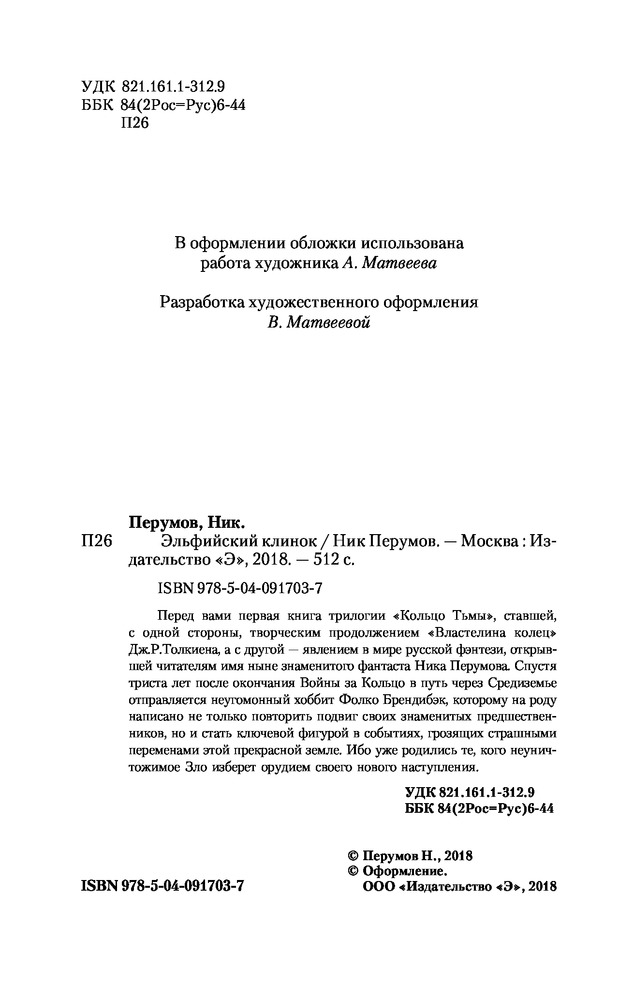 Эльфийский клинокВ данный момент этот товар отсутствует в продаже. Возможно, у нас найдется аналогичный или похожий товар здесь. Трилогия Ника Перумова «Кольцо тьмы» возвращает читателя в мир «Властелина Колец» Дж. Р. Толкиена. Она описывает Средиземье через триста лет после победы над Сауроном и уничтожения Кольца Всевластья, во времена Четвертой Эпохи. Хоббит Фолко Брендибэк выходит в ночь за гномом Торином. Вместе им предстоит найти верных друзей, пережить множество приключений, пройти все Средиземье от края до края, побывать даже там, куда не добиралась четверка хоббитов-хранителей, сразиться с сильнейшим врагом и спасти мир от зла, вернувшегося вновь, и зла, которое только обретает свою страшную силу... Ник Перумов открывает завесу тайны над событиями, оставленными в тени создателем «Властелина Колец», населяет его мир новыми героями, такими как золотой дракон Познания Орлангур, и вводит в извечную борьбу Тьмы и Света третью силу. «Кольцо Тьмы», ставшее дебютом Ника Перумова, вознесло своего автора на Олимп отечественного фэнтези и стало прекрасным началом успешной литературной карьеры. |