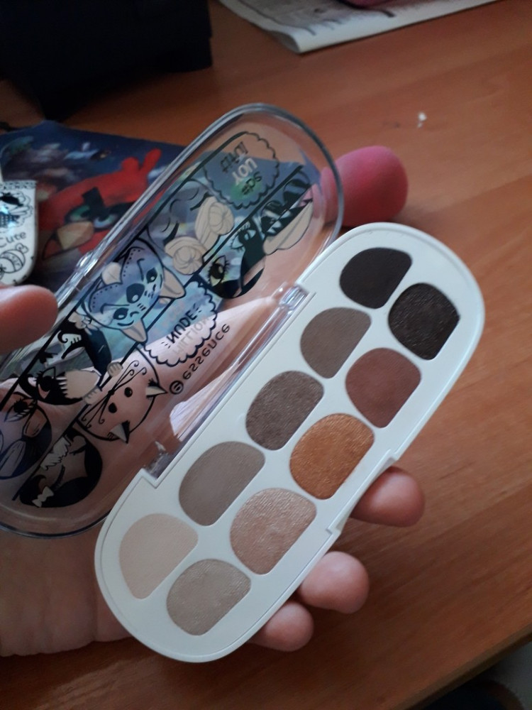 Люблю тени Эссенс в принципе, т.к. хорошо ложатся и не скатываются. А эта палитра крутая, заказала из-за кирпичного оттенка - на разочаровалась ни в кирпичном, ни в остальных! Также использую самый темный коричневый оттенок для бровей - наносится и держится лучше многих теней для бровей (на бровях не блестит и не "съедается" к вечеру) + идеальный холодный оттенок для брюнеток и шатенок.