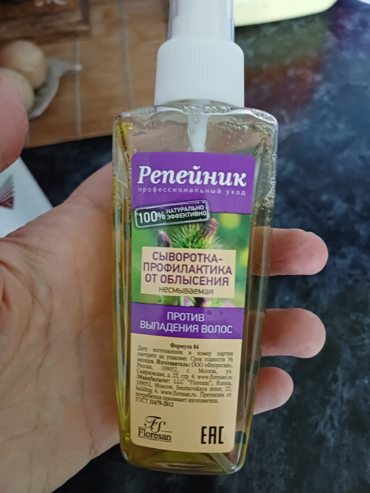Флакон с помпой-дозатором, внутри - водянистая жидкость с растительным запахом. Брала мужу, об облысении пока и речи не идет, но в последнее время стали выпадать волосы. Хватило на 18 дней ежедневного применения. Наносили по проборам на кожу головы, затем массировали, как указано в инструкции. Несмотря на наличие перца никакого жжения не было. Хотя именно жжение перца вызывает прилив крови к коже головы и волосяным луковицам, отчего волосы должны получать насыщенное питание и, как следствие, крепче держаться. Но даже ощущения легкого тепла не было, как и хоть какого-нибудь заметного результата. Волосы как выпадали, так и продолжают выпадать. Средство оказалось бесполезным. Конечно, причина потери волос кроется в состоянии здоровья, и косметическое средство - всего лишь косметическое средство, а не лекарство. Тем не менее, хотелось бы, чтобы хоть что-то из обещаний производителя проявилось в результате использования.