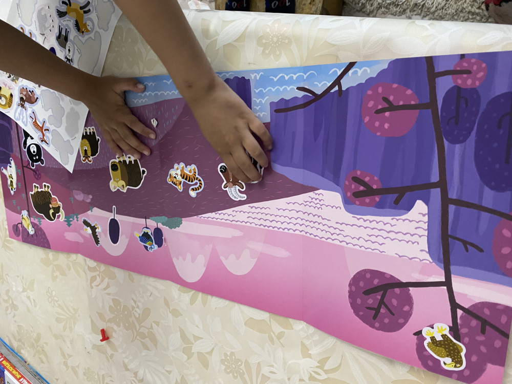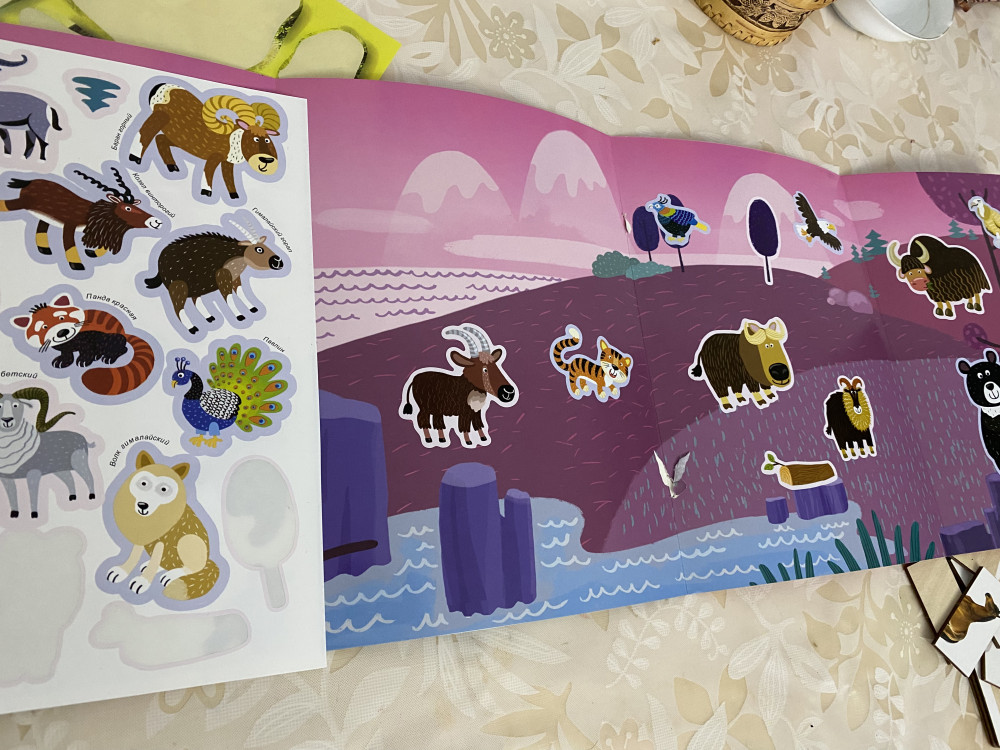 Красивая панорамка с животными, обитающими высоко в горах. Достаточно много наклеек, при этом - с описаниями животных. Это очень существенно, потому что животные Гималаев - плохо знакомы не только детям, но и обо многих из этих животных не знают даже взрослые.