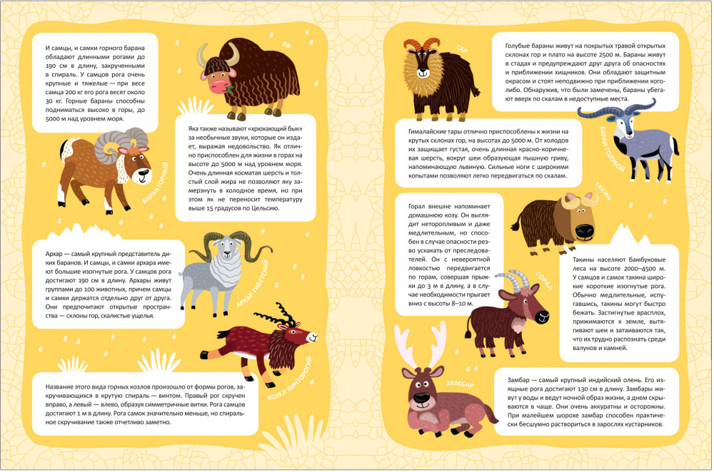 Помимо множества занимательных фактов внутри книги малыша ждет сюрприз – большая панорамная иллюстрация с изображением горного пейзажа. Дополняя ее яркими многоразовыми наклейками – животными Гималаев, он не только закрепит новые знания, но и создаст красочный плакат, которым можно украсить стены комнаты. |