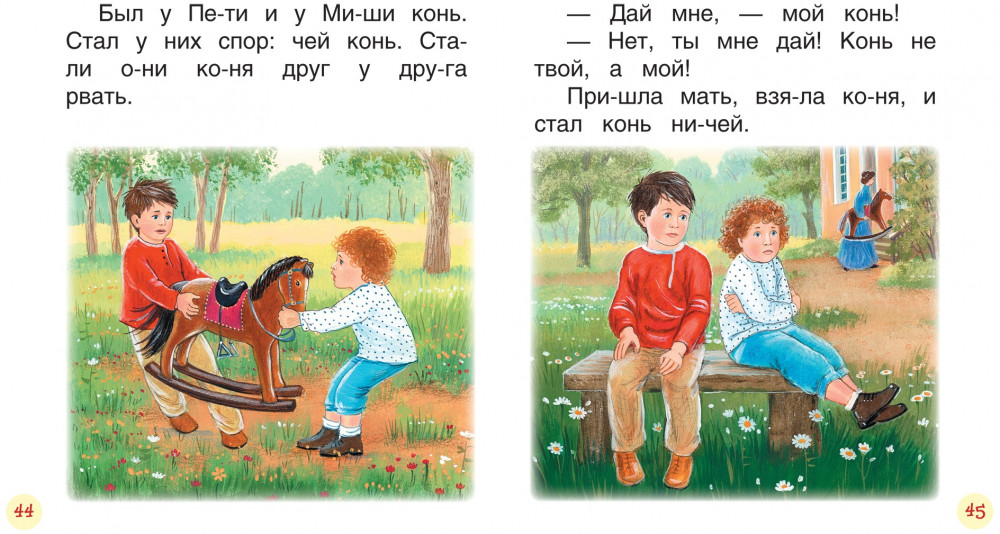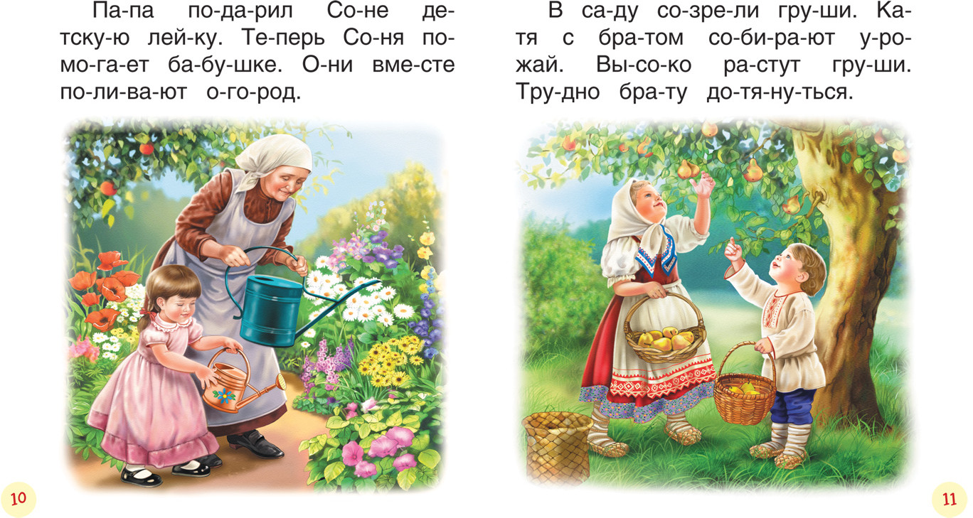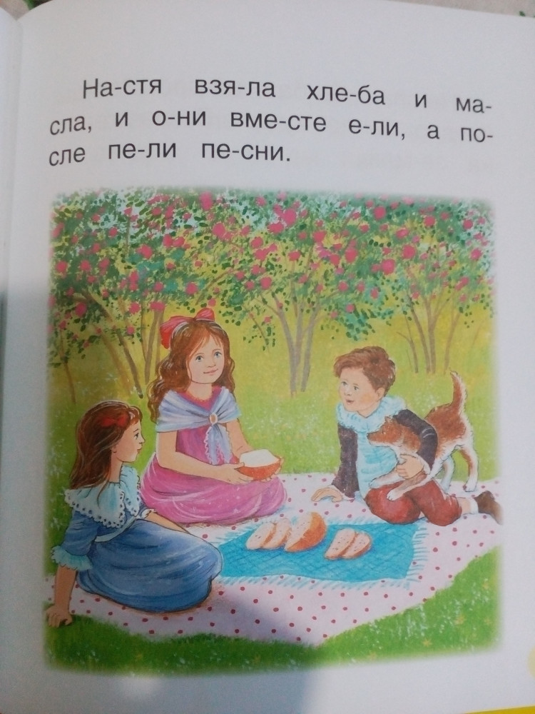 Слова разделены на слоги. Для нас это не удобно. Тексты из 2-3 предложений. А остальное на странице картинка. В общем, на мой взгляд, очень уж мало текста. Зависит от уровня чтения ребенка, конечно, для нас уже не совсем подходит (ребенку 6 лет). Читаем за раз по 10 страниц, и книга всего на неделю (((. В целом книга очень достойна, твердый переплет, плотные листы.