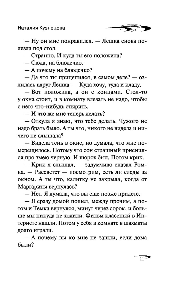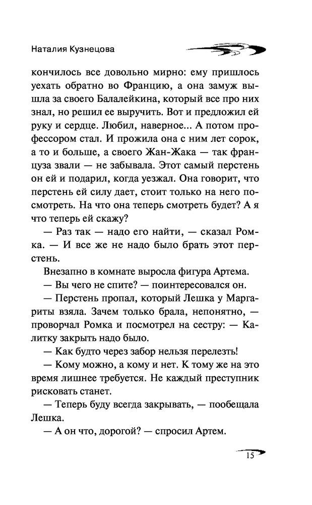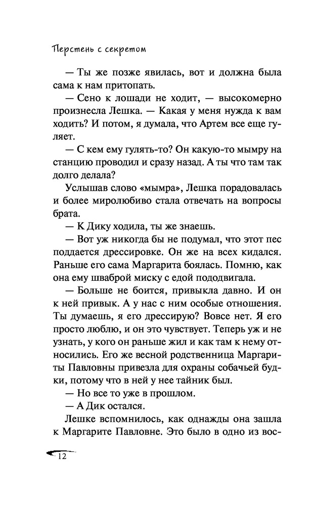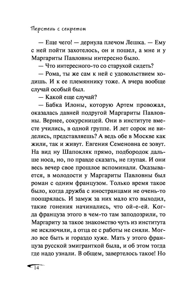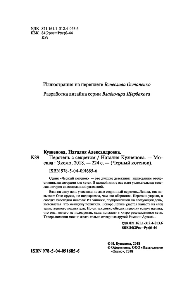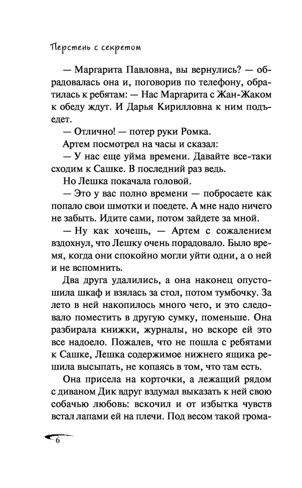 Перстень с секретомНаталия Александровна Кузнецова В данный момент этот товар отсутствует в продаже. Возможно, у нас найдется аналогичный или похожий товар здесь. Серия: Черный котенок. Новое оформление Взяв на одну ночь у соседки по даче старинный перстень, Лешка, так называют Олю друзья, не подозревала, чем это обернется. Перстень украли, а соседка бесследно исчезла! Из записки, подброшенной на следующий день, выясняется, что женщину похитили. Вскоре Лешке удается напасть на след таинственного похитителя. Но он так ловко обводит девочку вокруг пальца, что она, ничего не подозревая, сама попадает в хитро расставленные сети. Теперь помощи можно ждать только от верных друзей Ромки и Артема... |