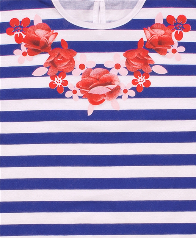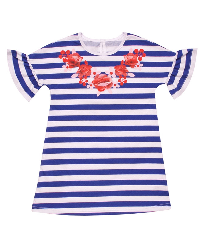 Хороший трикотаж у этой компании. Платье подошло под размеру: на рост 104 взяли 110, по длине - до середины икры, по ширине в плечах - село точно (не очень худой, но не полный ребенок). Красные розы на фото показались объемным оформлением, в действительности - отличного качества принт. Рекомендую!