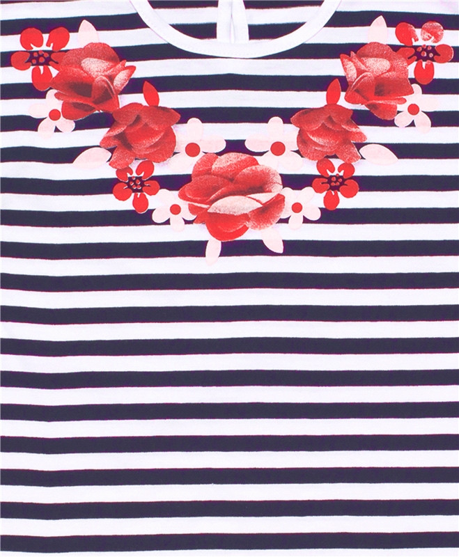 Хороший трикотаж у этой компании. Платье подошло под размеру: на рост 104 взяли 110, по длине - до середины икры, по ширине в плечах - село точно (не очень худой, но не полный ребенок). Красные розы на фото показались объемным оформлением, в действительности - отличного качества принт. Рекомендую!