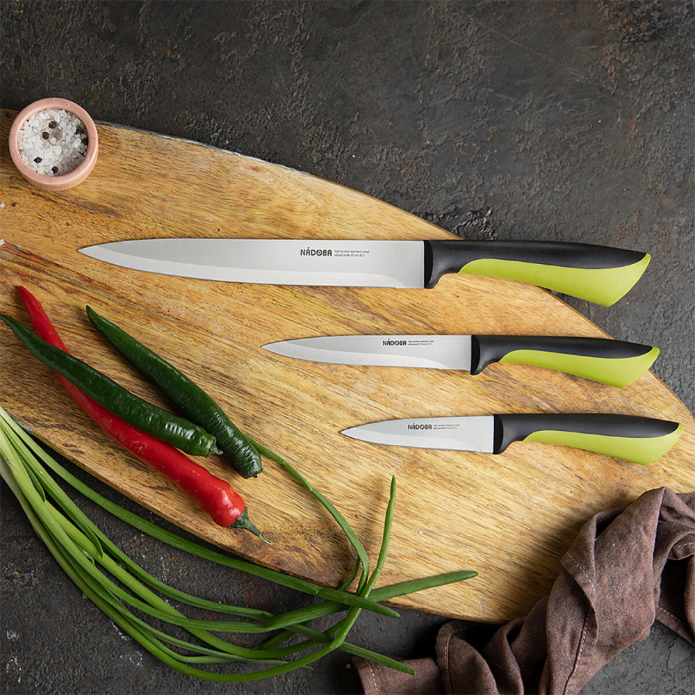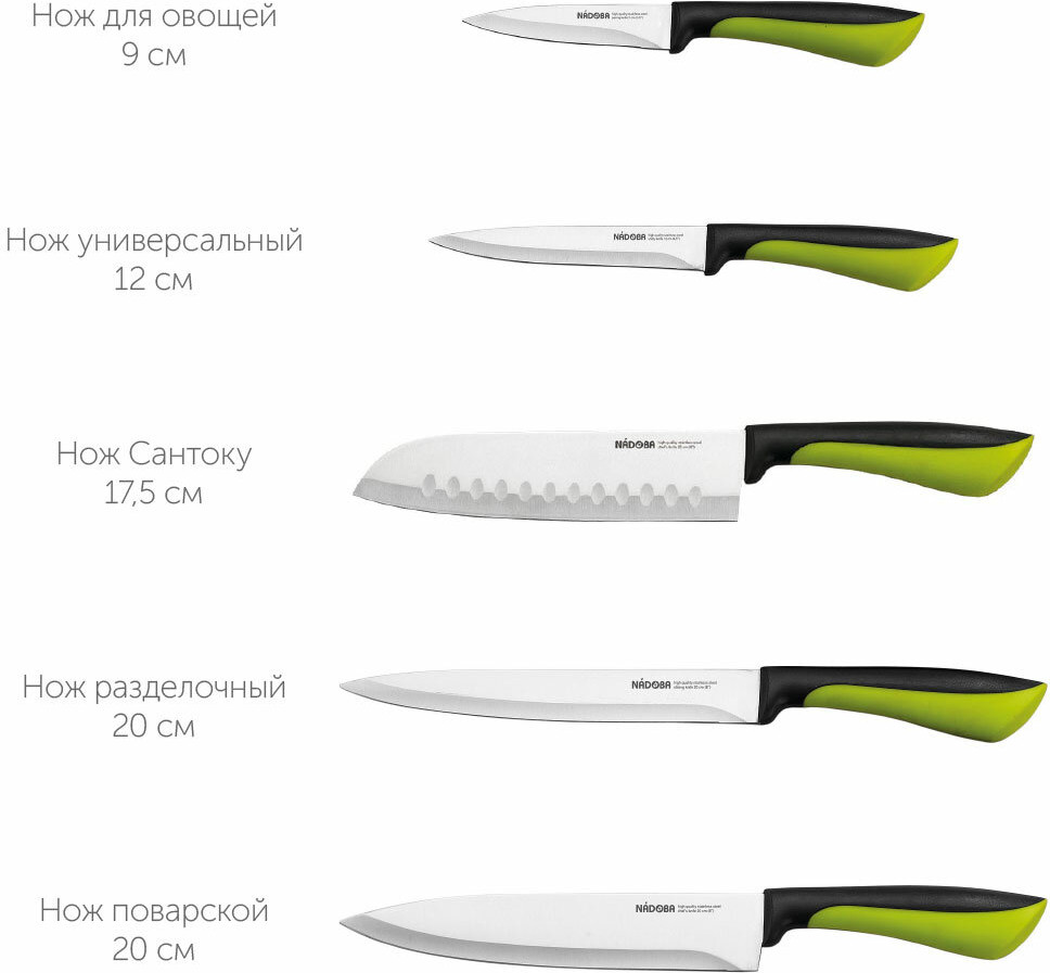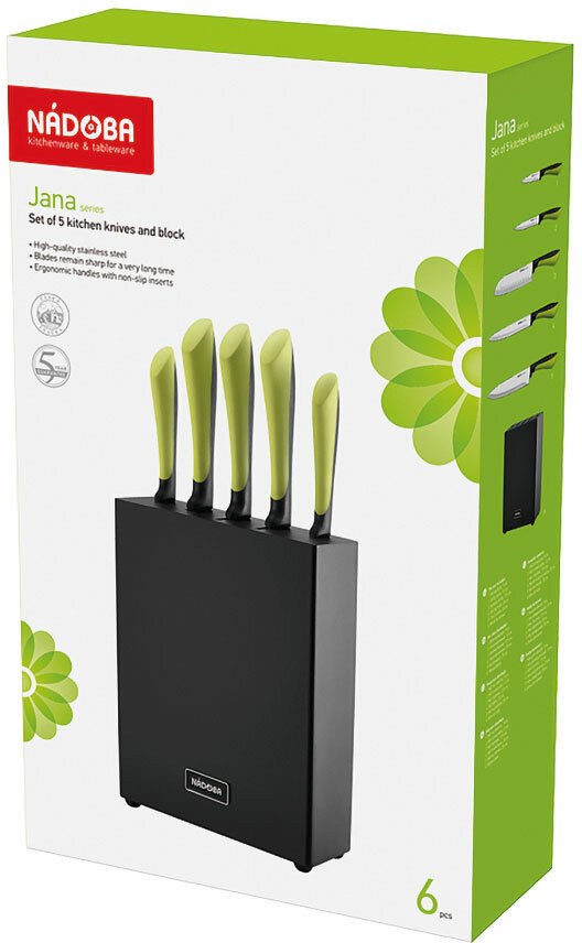 Nadoba Набор кухонных ножей с универсальной подставкойострые отличные блок пластик В данный момент этот товар отсутствует в продаже. Возможно, у нас найдется аналогичный или похожий товар здесь. Серия: Jana Ножи серии Jana изготовлены из высококачественной нержавеющей стали, их лезвия остаются острыми долгое время. Эргономичные ручки ножей выполнены из высокопрочного пластика с противоскользящей резиновой вставкой. Блок для хранения ножей выполнен из натурального дерева (гевея). |