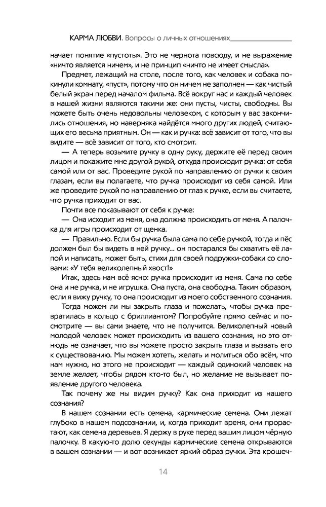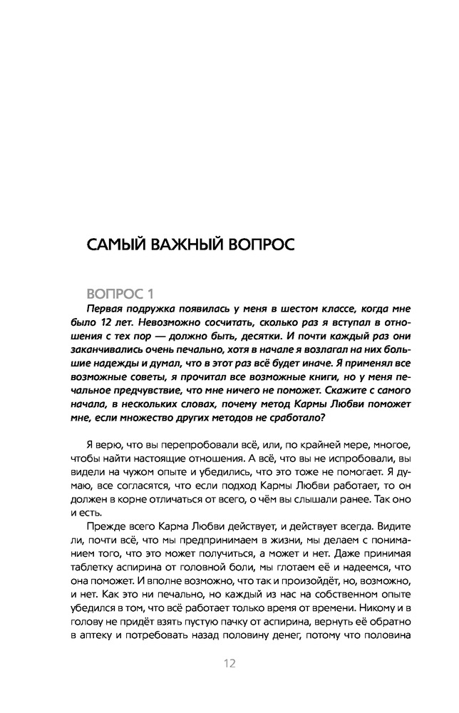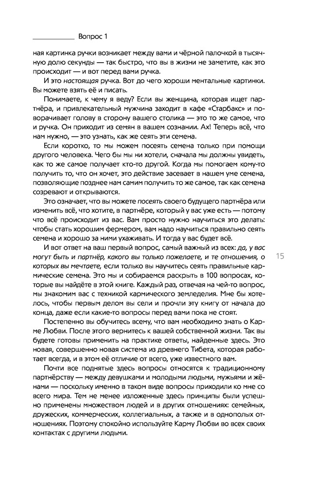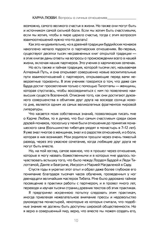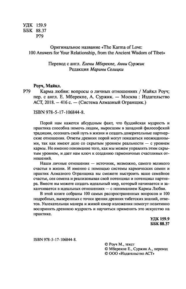 На мой взгляд, это самая лучшая книга об отношениях. Книга содержит ответы на 100 вопросов обо всем, что касается отношений, любви и секса с точки зрения кармы. Причем и на вопрос "Почему" и на вопрос "Как сделать, чтобы было так, как я хочу". Автор показывает взаимосвязь между нашими действиями и тем, что мы имеем в итоге. М.Роуч не возводит свои знания в ранг секрета и не "размазывает" ответы, как любят это делать в американских фильмах. Заказывала эту книгу 2 года назад на Флипе и периодически с удовольствием ее перечитываю. Всем рекомендую!