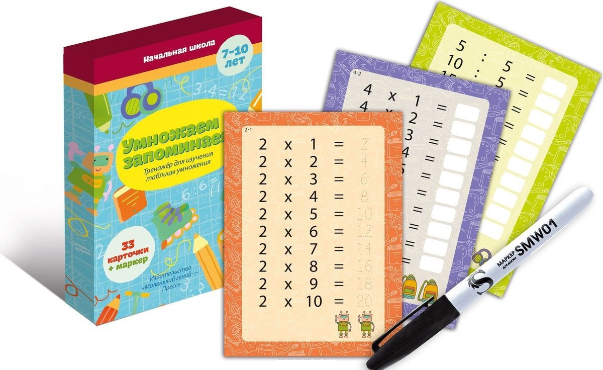 Комплект состоит из маркера и 33 двухсторонних ламинированных карточек, на которых нужно решать примеры на умножение и деление. Написанное легко стирается, поэтому карточки можно многократно использовать.