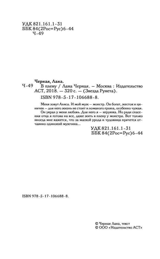 В пленуВ данный момент этот товар отсутствует в продаже. Возможно, у нас найдется аналогичный или похожий товар здесь. Серия: Звезда Рунета Меня зовут Алиса. И мой муж — монстр. Он богат, жесток и циничен — для него жизнь не стоит и ломаного гроша, особенно чужая. Он украл у меня любовь. Для него я — игрушка. Но ради спасения отца я готова на все, даже жить в плену у монстра. Вот только иногда мне кажется, что за маской урода и чудовища прячется отчаянно одинокий мужчина... |