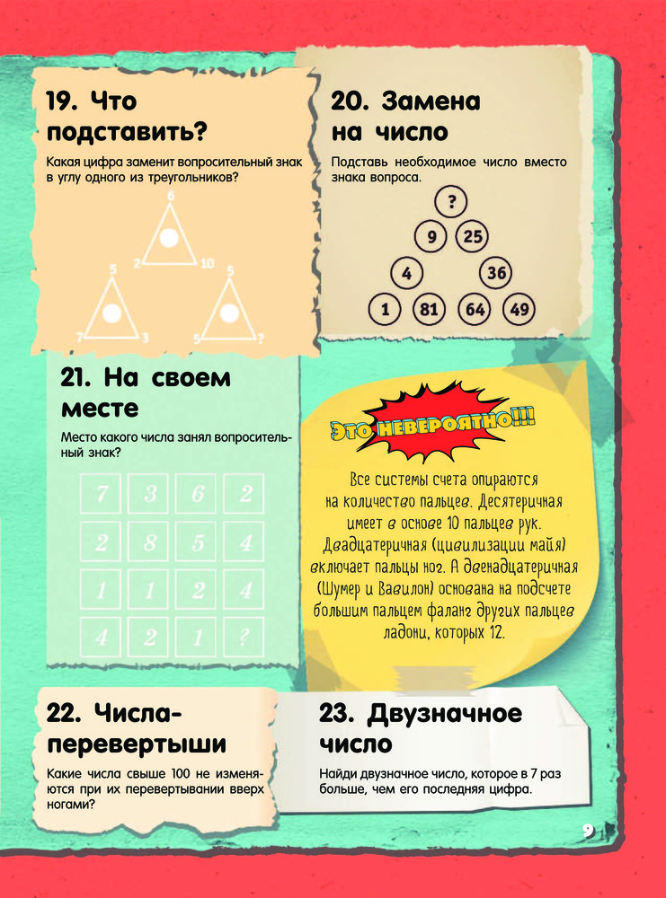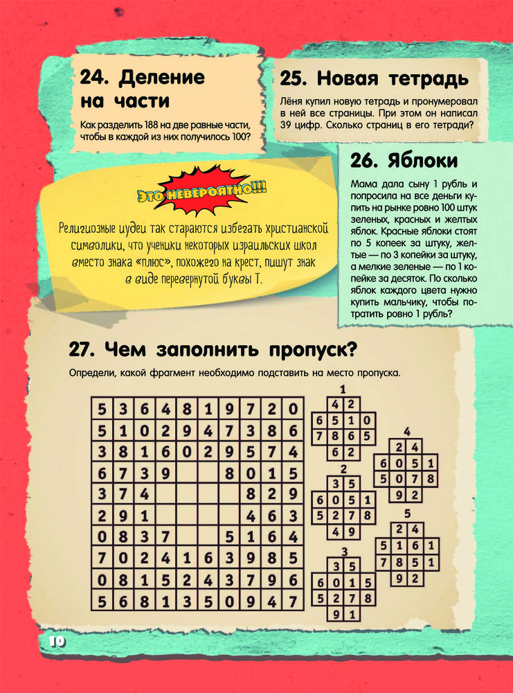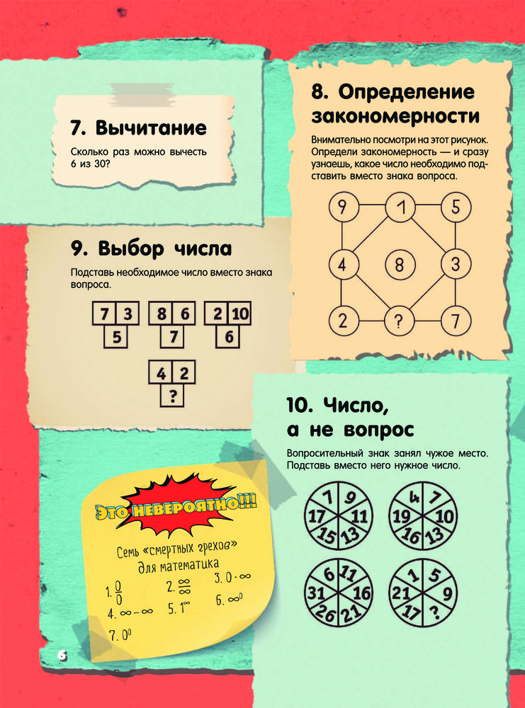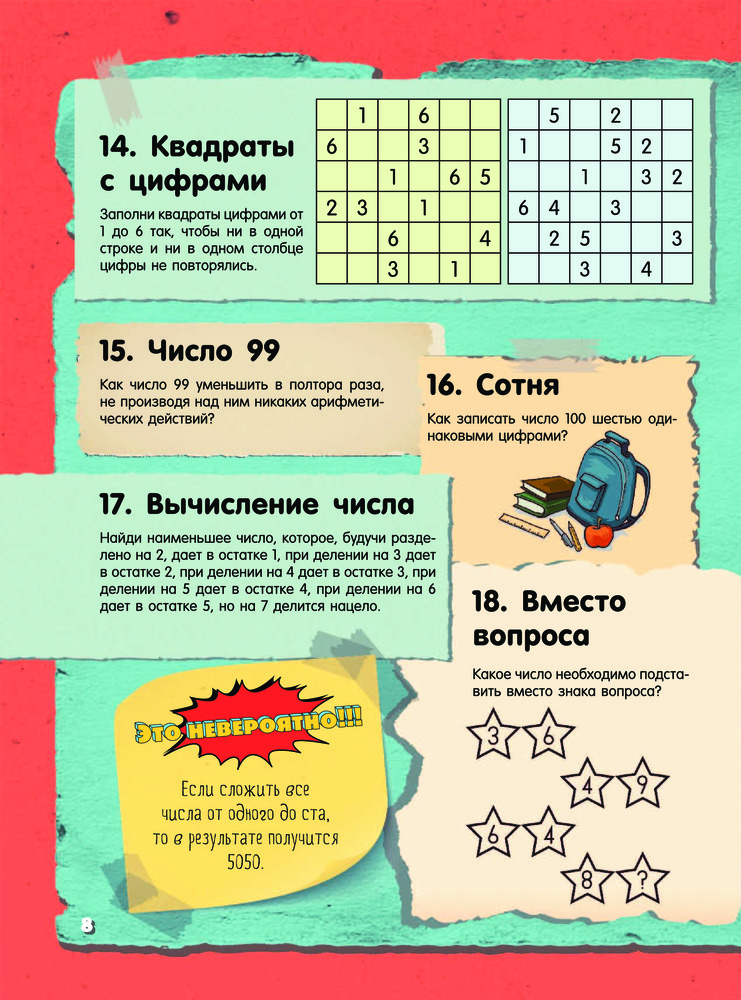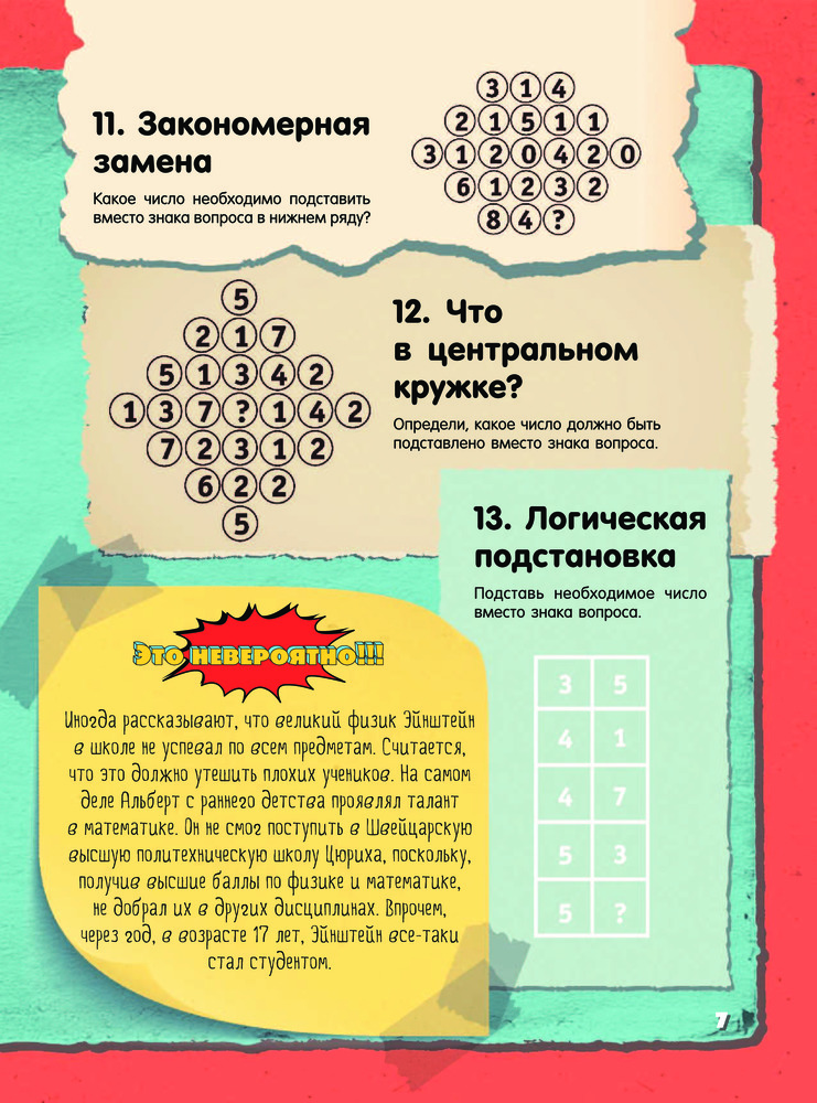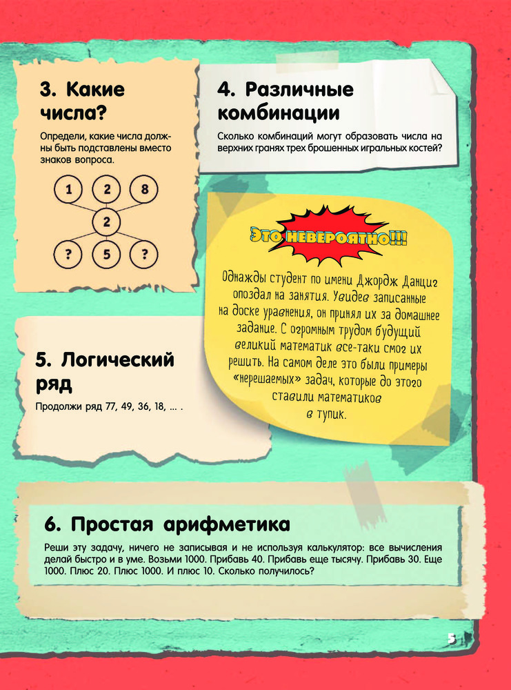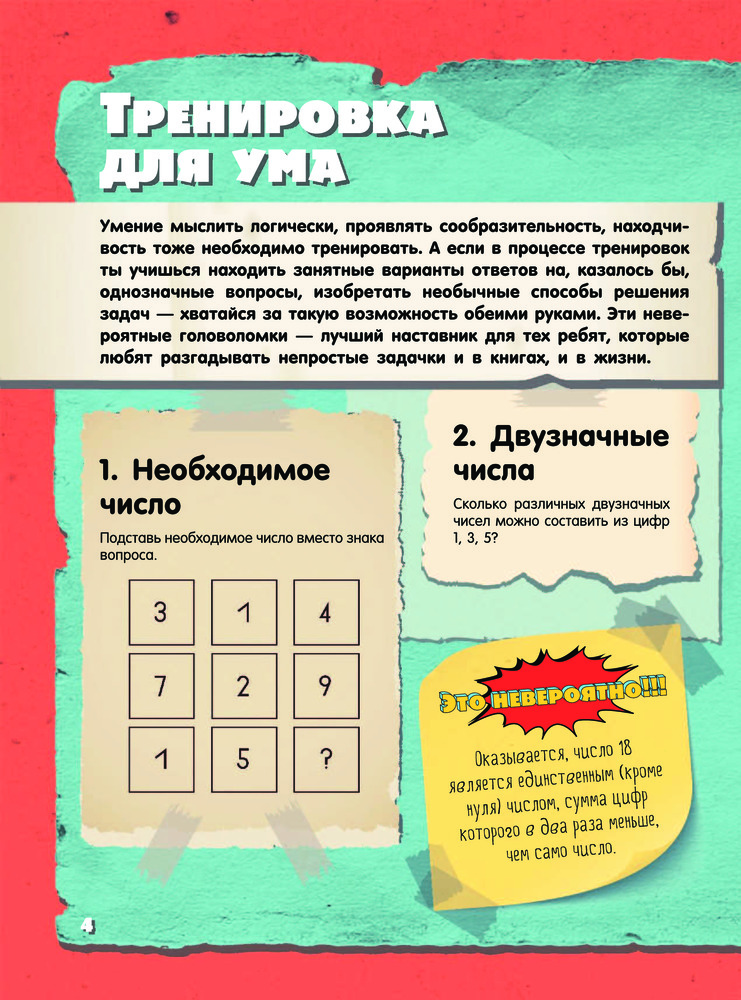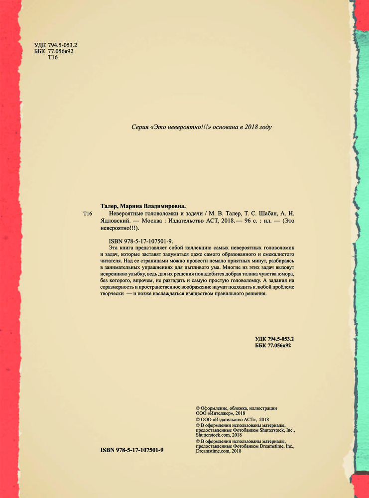 Невероятные головоломки и задачиТ. С. Шабан, Андрей Николаевич Ядловский, Марина Владимировна Талер В данный момент этот товар отсутствует в продаже. Возможно, у нас найдется аналогичный или похожий товар здесь. Серия: Это невероятно!!! Это издание адресовано прежде всего тем читателям, кто любит разгадывать невероятные задачки на сообразительность и готов искать нестандартные пути решения лишь на первый взгляд стандартных заданий Таким пытливым умам будут интересны и занимательные факты из области математических наук. Эти факты напомнят, что точный расчет, образное, пространственное и логическое мышление необходимы и важны не только в школе. А уж без бытовой смекалки и чувства юмора в повседневной жизни и подавно не обойтись. И пусть наши невероятные головоломки не сразу раскроют свои секреты — внимание, терпение и умение не сдаваться помогут все же получить правильный ответ. |