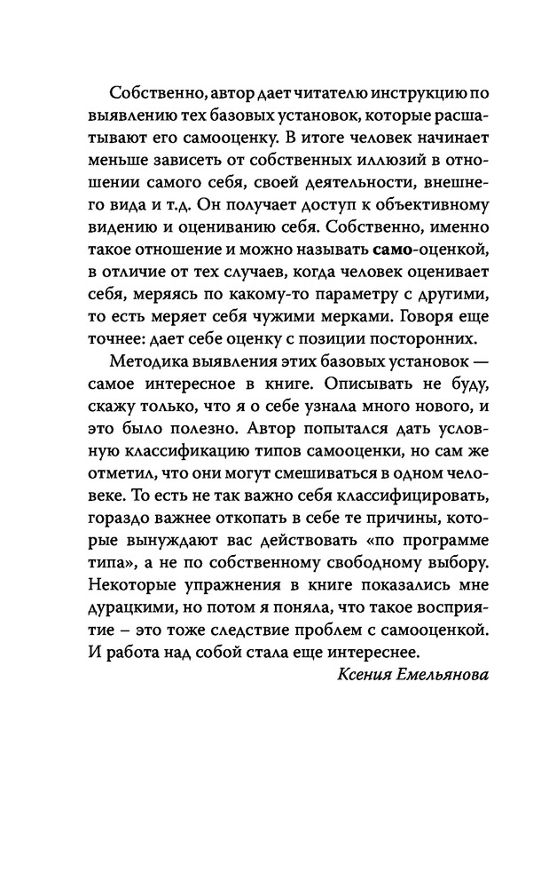 хорошая книга. Прежде чем работать над своей самооценкой, нужно сначала прочитать её. тогда может и не придется читать всю остальную психологическую литературу