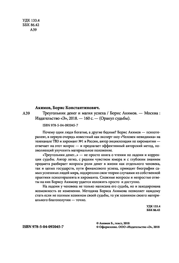 Заказа книгу Бориса Акимова, Треугольник денег. Очень расстроилась, так как автор, не открывает никакой информации, касательно его деятельности. В книге напечатаны различные цитаты, и много не нужной воды, скаченной с интернета. На своём ютуб канале, автор делится со своим зрителем, а книга бесполезная от слово вообще!