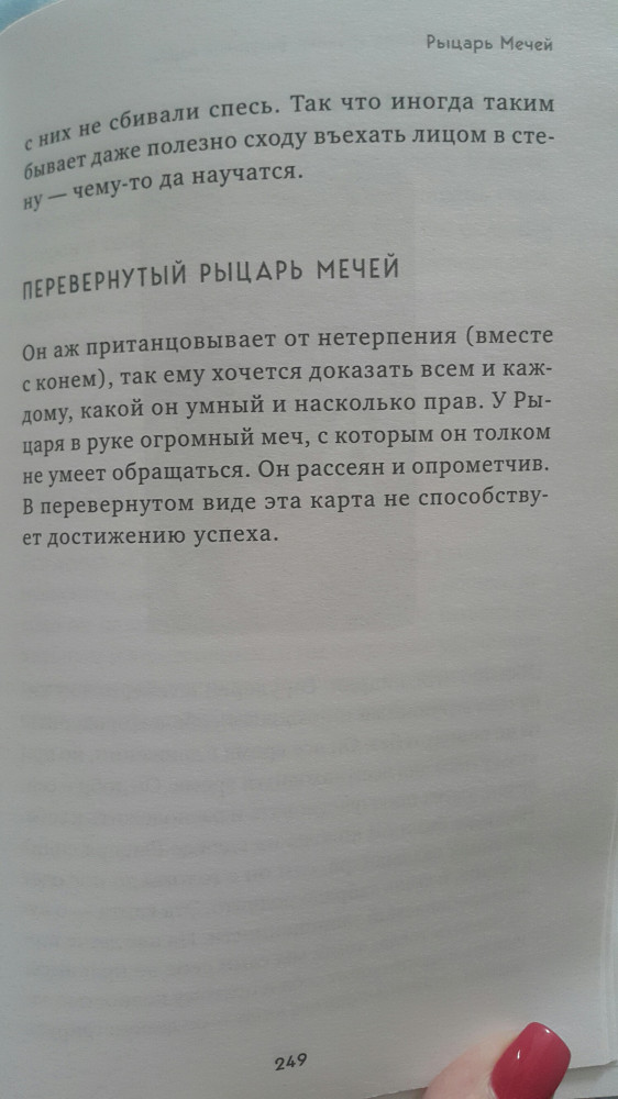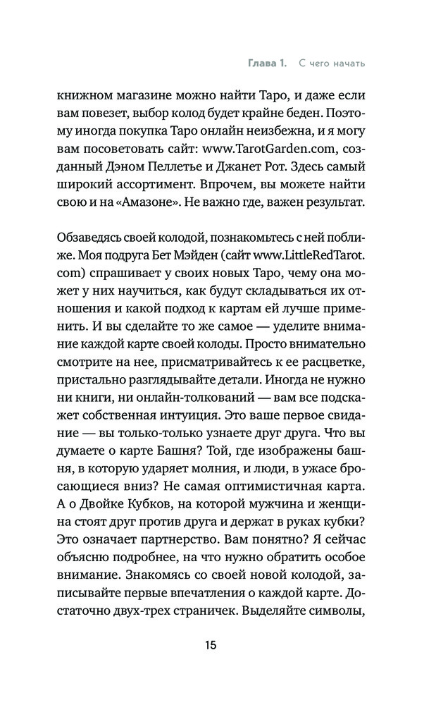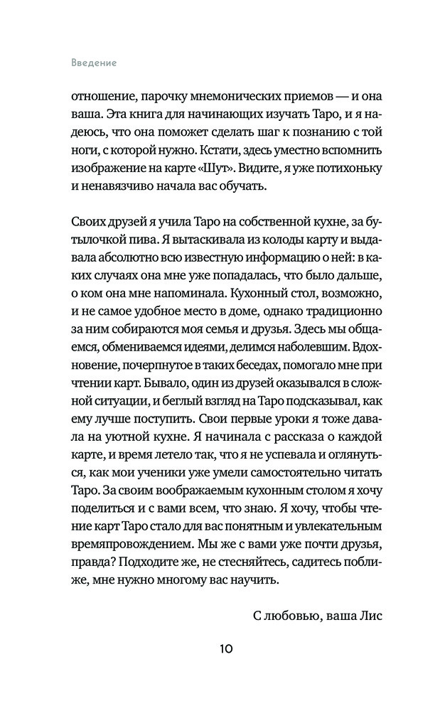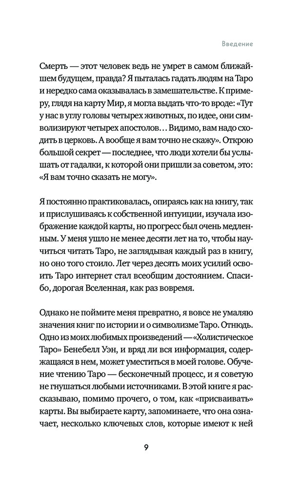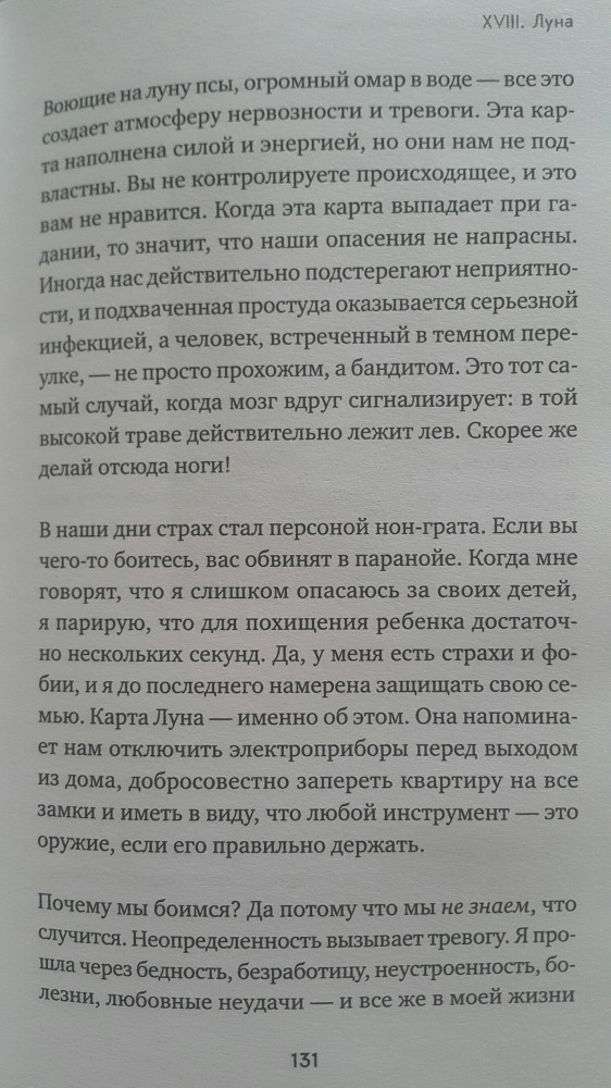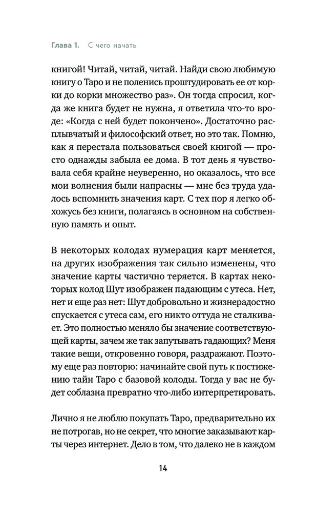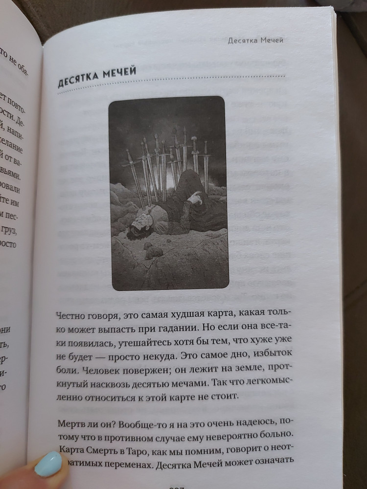 Книга читается легко. В ней почти нет никаких теоретических моментов . Только рассказы из практики автора и её видение толкований арканов. Руководством конечно сложно назвать. Но почитать интересно. Очень понравилось издание, оформление книги. Обложка замечательная, листы белые, шрифт крупный.