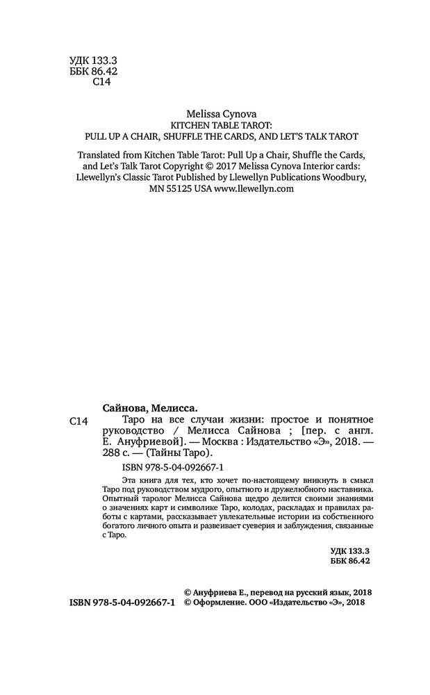 Книга не понравилась.Нету полной трактовки карт.Все написано коротко и понятным контекстом.Также, не было достаточной информации про гадание себе самой. Если вы хотите серьезно изучить карты, не советую покупать эту книгу