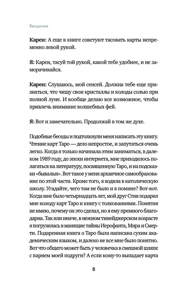 Книга написана очень простым языком. Автор делится своими впечатлениями и навыками. Это не первая моя книга по Таро. До этого читала других авторов, смотрела ролики в интернете.. Но я не жалею, что ее взяла. Очень простой стиль изложения делает материал доступным и интересным. При этом автор не навязывает свое мнение, а говорит о разных вариантах, и что именно предпочитает он сам. Выбор всегда за тарологом.