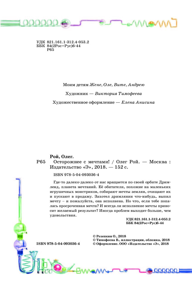 В данный момент этот товар отсутствует в продаже. Возможно, у нас найдется аналогичный или похожий товар здесь. Серия: Мечтатели. Детский проект О. Роя Где-то далеко-далеко от нас вращается по своей орбите Дримленд, планета мечтаний. Её обитатели, похожие на маленьких игрушечных монстриков, собирают мечты землян, очищают их и пускают в продажу. Захотел дримлянин что-нибудь, выпил мечту — и пожалуйста, она исполнена. Но что, если тебе попалась просроченная мечта? И всегда ли исполнение мечты приносит желаемый результат? Иногда проблем выходит больше, чем удовольствия.