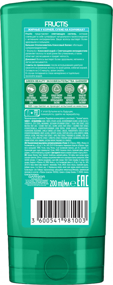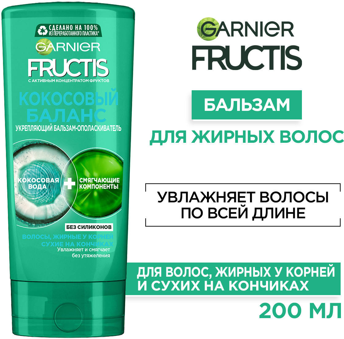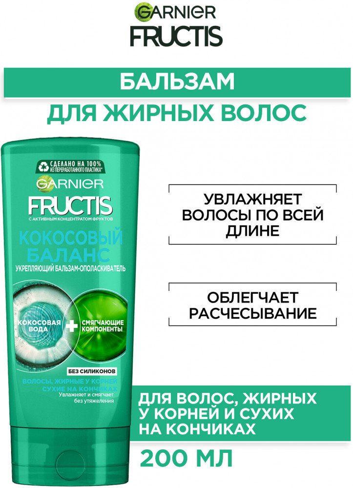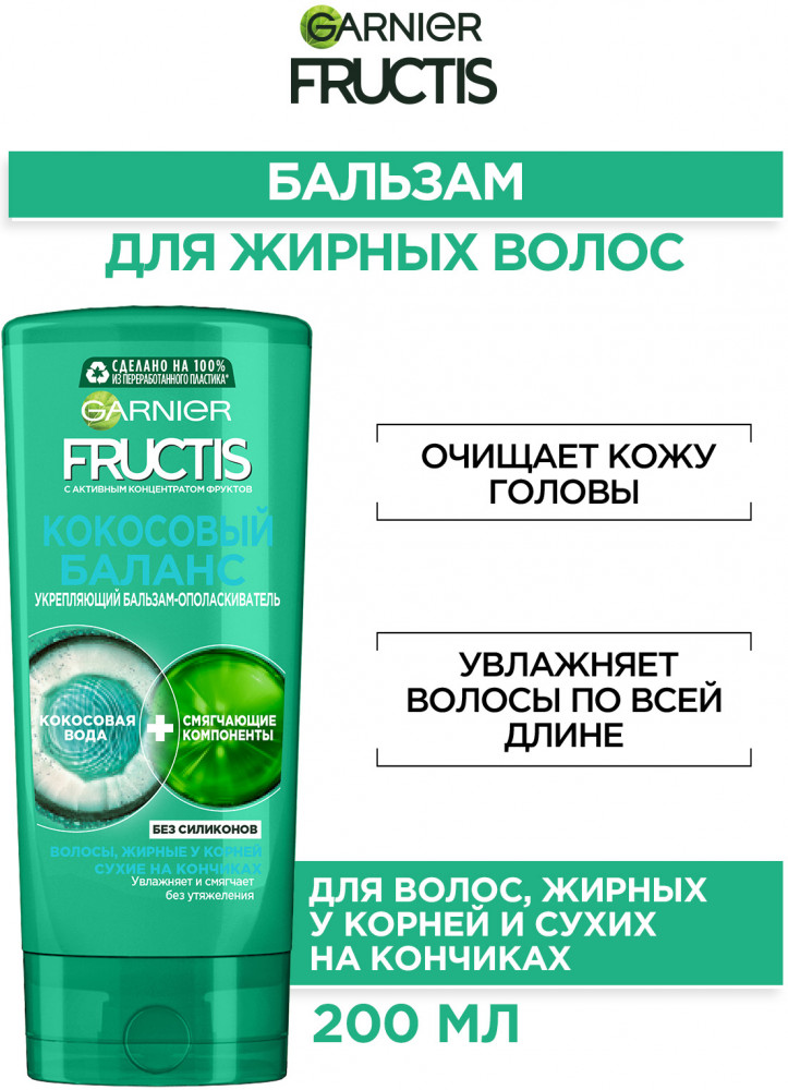 Garnier Укрепляющий бальзам «Кокосовый Баланс» для волос жирных у корней и сухих на кончиках-28% +49 смягчение легкое расчёсывание не электризует не для жирных не для чувствительной