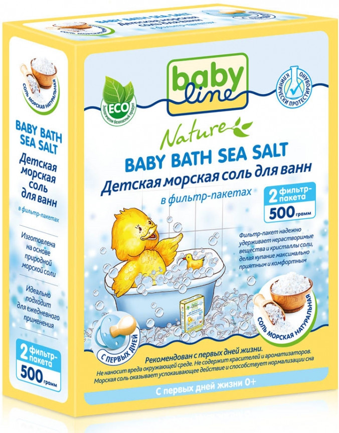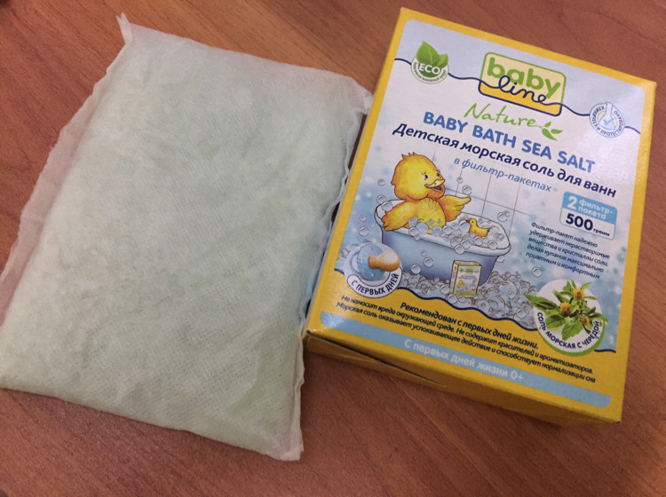 Соль хорошая, понравилась! Для купания малыша с первых дней подходит. Упакована в мягкие мешочки для разового применения, осадок остаётся в мешочке после растворения.