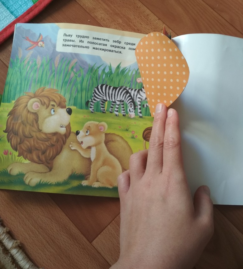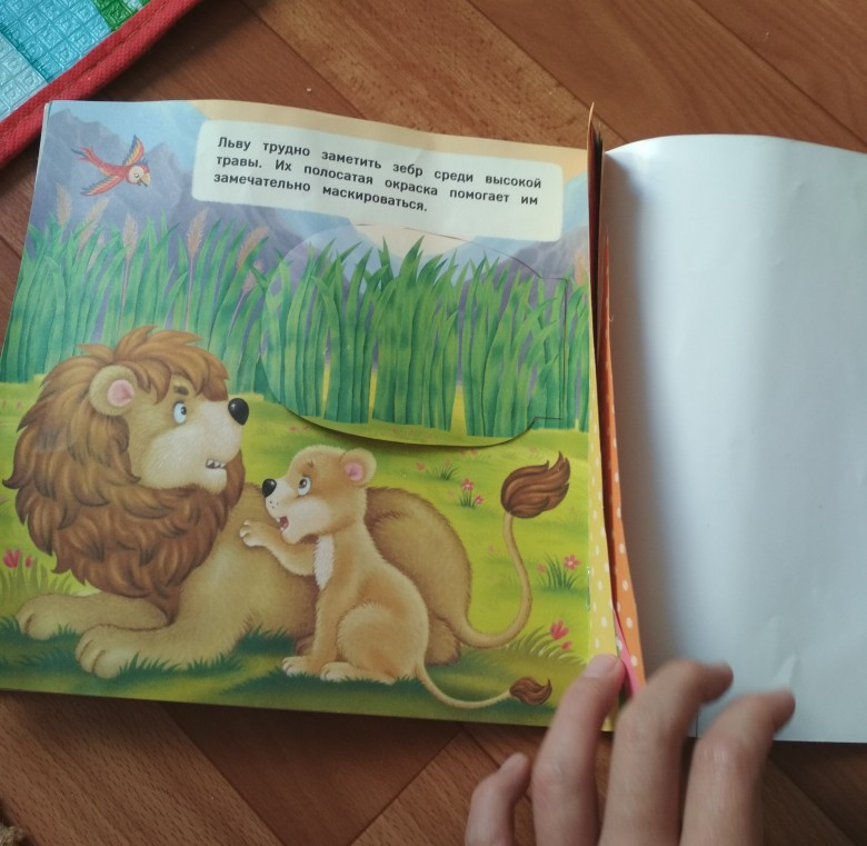 Книга интересная, хорошая идея! Рисунки красивые, бумага средней плотности. Правда чтобы сделать окошки нужно потрудиться. Лучше всего это делать родителям, чтобы хорошо вышло. Половину книги занимают заготовки окошек. Срезать их нужно аккуратно, подальше от места, где книжка крепиться к обложке скобками. Советую чёрный контур срезать, чтобы окошко не было видно на картинке. По окончании работы, я подклеила отрезаные "хвостики" скотчем, чтобы было аккуратно. В итоге получилось 12 страниц с окошками. Рекомендую для детей 2-3 лет, в более раннем возрасте порвут книгу.
