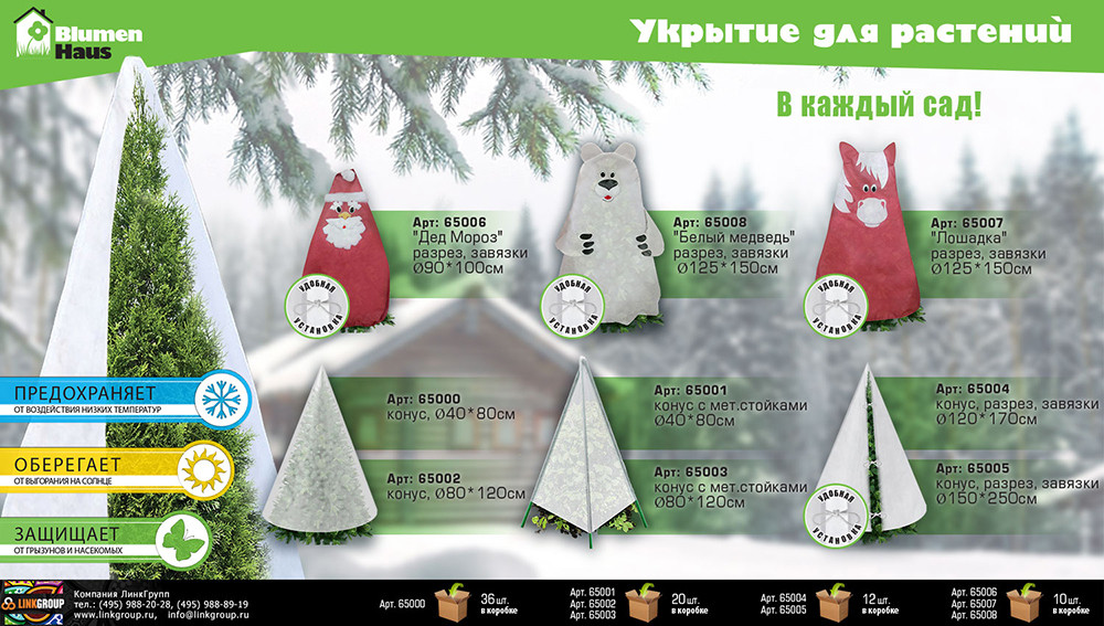 В данный момент этот товар отсутствует в продаже. Возможно, у нас найдется аналогичный или похожий товар здесь. Серия: Укрытие из спанбонда Oберегает растение от выгорания на солнце. Предохраняет от воздействия низких температур. Защищает от грызунов и насекомых.