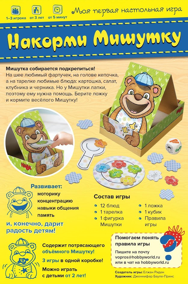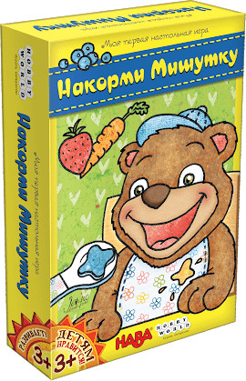 Основа игры — это объёмная картонная конструкция весёлого Мишутки, которого можно кормить через специальное отверстие с помощью ложечки и жетонов различных блюд. На выбор предлагается шесть угощений различного цвета: рис, картошка, морковка, клубника, салат, черника. По сути, перед вами сборник из трёх различных игр, направленных на развитие различных навыков:
