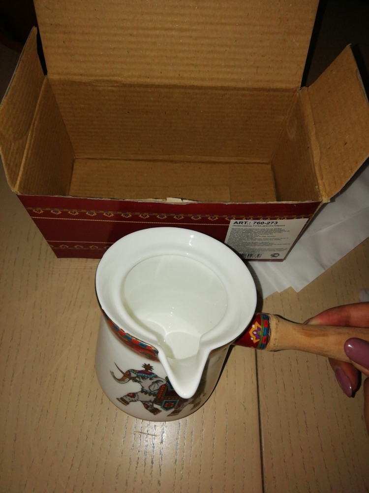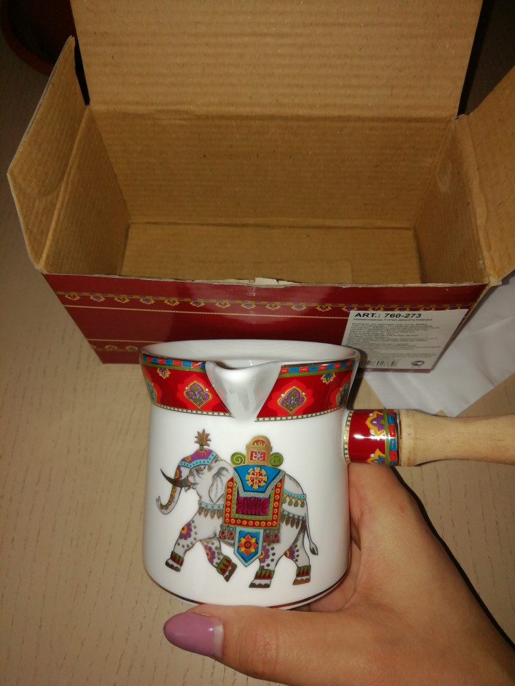 Очень красивая турочка! Объем небольшой. Приятно варить кофе в такой посуде! Он становится еще вкуснее!)))