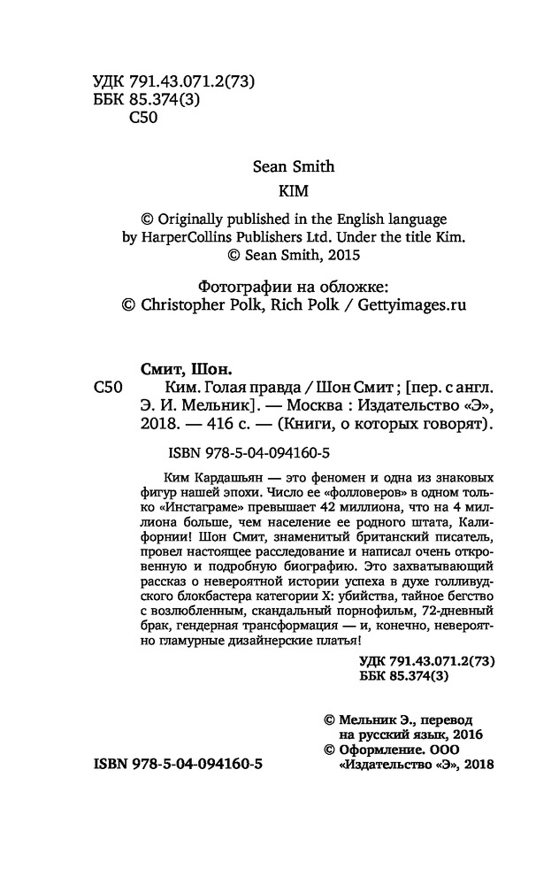 Ким. Голая правдаВ данный момент этот товар отсутствует в продаже. Возможно, у нас найдется аналогичный или похожий товар здесь. Серия: Книги, о которых говорят Ким Кардашьян — это феномен и одна из знаковых фигур нашей эпохи. Число ее «фолловеров» в одном только «Инстаграме» превышает 42 миллиона, что на 4 миллиона больше, чем население ее родного штата, Калифорнии! Шон Смит, знаменитый британский писатель, провел настоящее расследование и написал очень откровенную и подробную биографию. Это захватывающий рассказ о невероятной истории успеха в духе голливудского блокбастера категории Х: убийства, тайное бегство с возлюбленным, скандальный порнофильм, 72-дневный брак, гендерная трансформация — и конечно невероятно гламурные дизайнерские платья! |