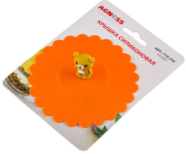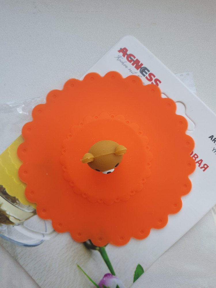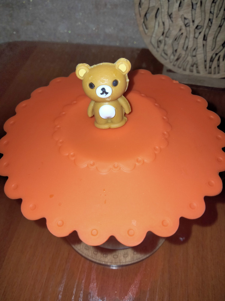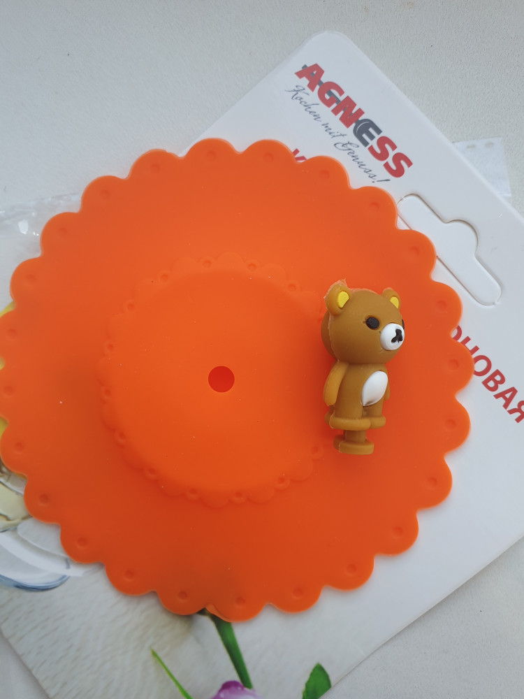 Крышка силиконовая, на стакан подходит. Яркая, красивая. Если в бокале горячий чай и его накрыть этой крышкой, то образуется вакуум мин на 5, потом сама отлипает. Мишка плохо обработан, т.е. его края, но на функциональность никак не влияет .