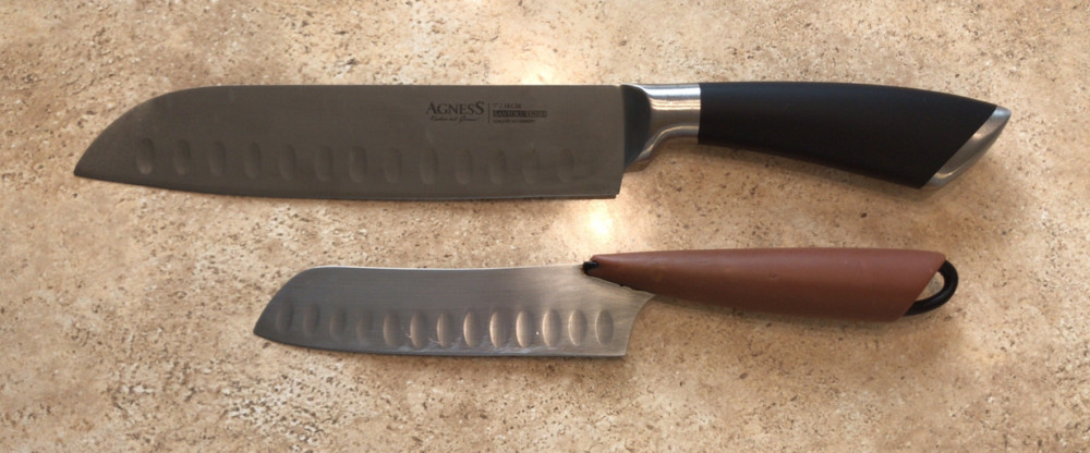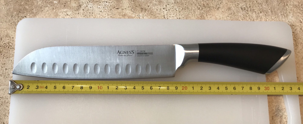 Выбирала из множества подобных. До него работала сантоку покороче. И, глядя на фото, надеялась, что лезвие будет длиной 17,5. Но нет)) у моего на лезвии написано 18 см, а фактически оно 18,5 см. Общая длина ножа 32 см. Пока непривычно, кажется нож огромный! Острый - с курицей, мясом справился прекрасно. Но, например, морковь, лук мне им шинковать неудобно, лезвие толще. Когда кладёшь на стол, какой-то неприятный дребезжащий звук. Как будто жесть. Со всеми другими ножами такого нет. Пользоваться, конечно, буду, но основная работа по-прежнему стареньким ножом.