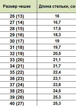 Заказала чешки 26 размера специально на размер больше на всякий случай! Но они совсем не 26 , всего 14,5 см ! Хотя на них наклейка 26! Еле еле одела ей ;( На один раз чешки! Очень узкие