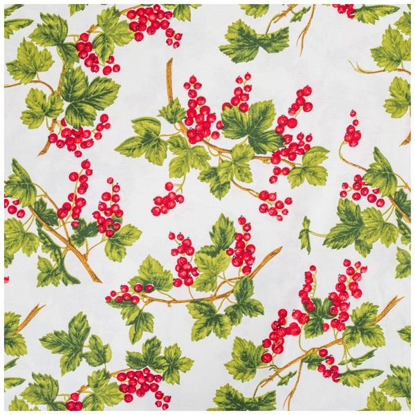 Полотно плотное, рисунок яркий, смотрится по- летнему ....нарядно, НО....при незначительном увлажнении холодной водой начинают расплываться красными пятнами ягоды, а при полном погружении в воду (холодную) начинают линять листья и вода становится бурой...как будет вести себя изделие в горячей воде и при машинной стирке покажет время...