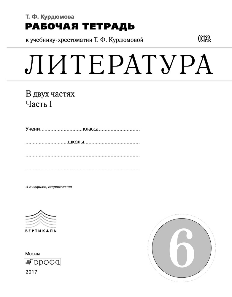 Литература. 6 класс. Рабочая тетрадь к учебнику-хрестоматии Т.Ф. Курдюмовой. В 2-х частях. Часть 1. С тестовыми заданиями ЕГЭ. Вертикаль. ФГОС+37