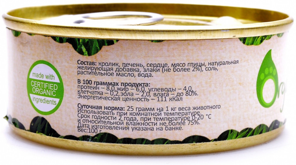 Состав: кролик, печень, сердце, мясо птицы, натуральная желирующая добавка, злаки (не более 2%), соль, растительное масло, вода.