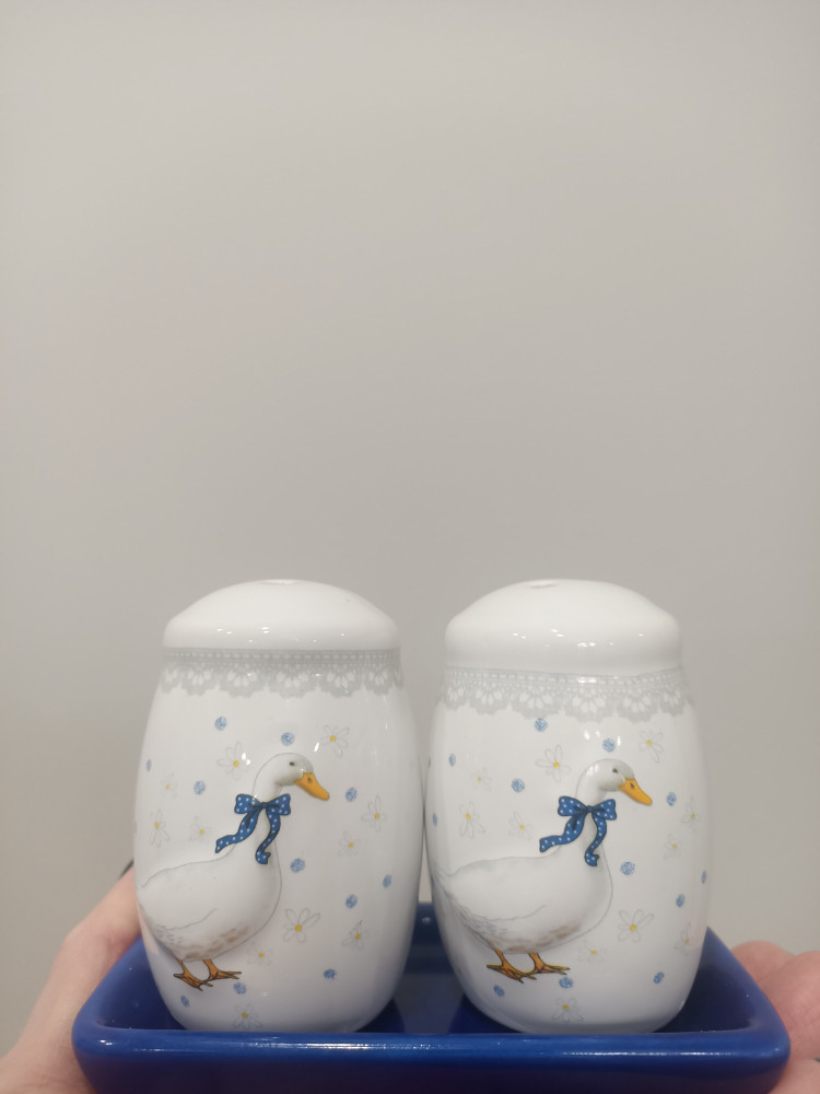 Очередные гуси в моей стае. :) Дополнили комплект к чайнику, чашками, баночкам для сыпучих, сахарнице и разделочной доске с гусями. Набор легкий, чувствуется фарфор, а не глина, в солонке три дырочки, в перечнице две (ну или кто как решит).