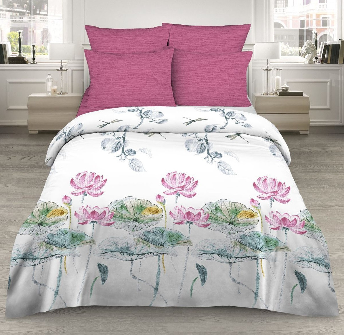 Приятная ткань, подушки и простынь насыщенного малинового цвета, пододеяльник с кувшинками,они не яркие, как будто размытые,такой нежный рисунок.Первый раз сполоснула,накрахмаленность смылась,теперь такая плотная ткань хб.Комплектом довольна.
