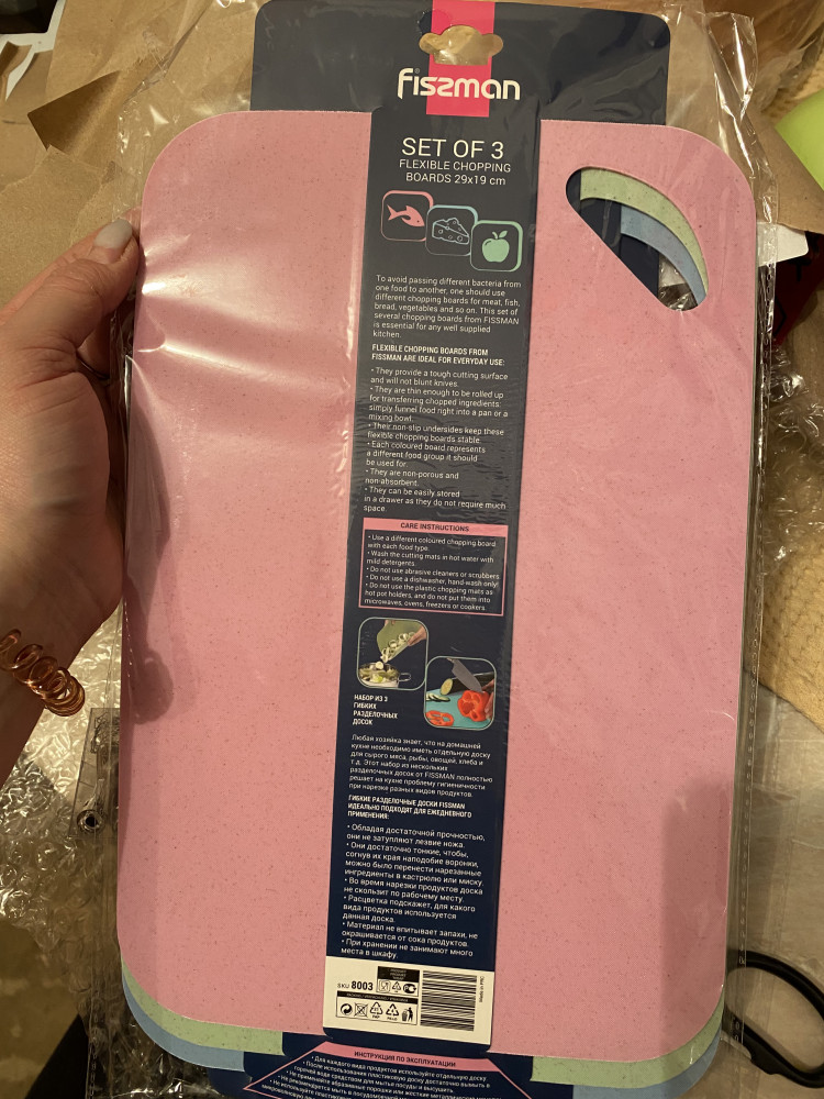 Fissman Набор из 3-х гибких разделочных досок (29х19 см)В данный момент этот товар отсутствует в продаже. Возможно, у нас найдется аналогичный или похожий товар здесь. Любая хозяйка знает, что на кухне необходимо иметь разные доски под мясо, рыбу, хлеб и т.д. Такой набор от Fissman полностью решает эту проблему. Гибкие разделочные доски идеально подходят для ежедневного использования, потому что: не тупят лезвия ножа, достаточно тонкие, чтобы их согнуть для удобства высыпания продуктов, во время нарезки доска не скользит по рабочему месту, яркая расцветка подскажет для какого вида продуктов используется доска, не впитывают запахи, не окрашиваются от продуктов, не занимают много места при хранении, их можно привесить, легко моются. Радуйте себя яркими и модными аксессуарами Fissman каждый день. |