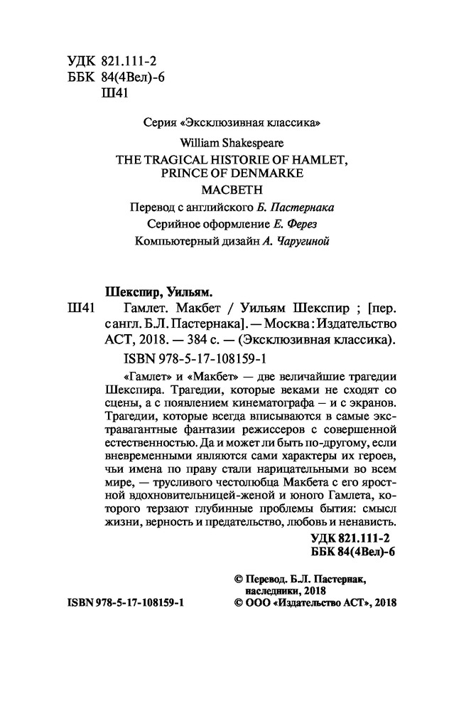 💳 Оплатить за товар можно при получении 🇰🇿 Есть бесплатная доставка по Казахстану от 1 дня 🎁 Копите бонусы с каждой покупки Серия: Эксклюзивная классика ?"Гамлет" и «Макбет» — две величайшие трагедии Шекспира. Трагедии, которые веками не сходят со сцены, а с появлением кинематографа — и с экранов. Трагедии, которые всегда вписываются в самые экстравагантные фантазии режиссеров с совершенной естественностью. Да и может ли быть по-другому, если вневременными являются сами характеры их героев, чьи имена по праву стали нарицательными во всем мире, — трусливого честолюбца Макбета с его яростной вдохновительницей-женой и юного Гамлета, которого терзают глубинные проблемы бытия: смысл жизни, верность и предательство, любовь и ненависть. |