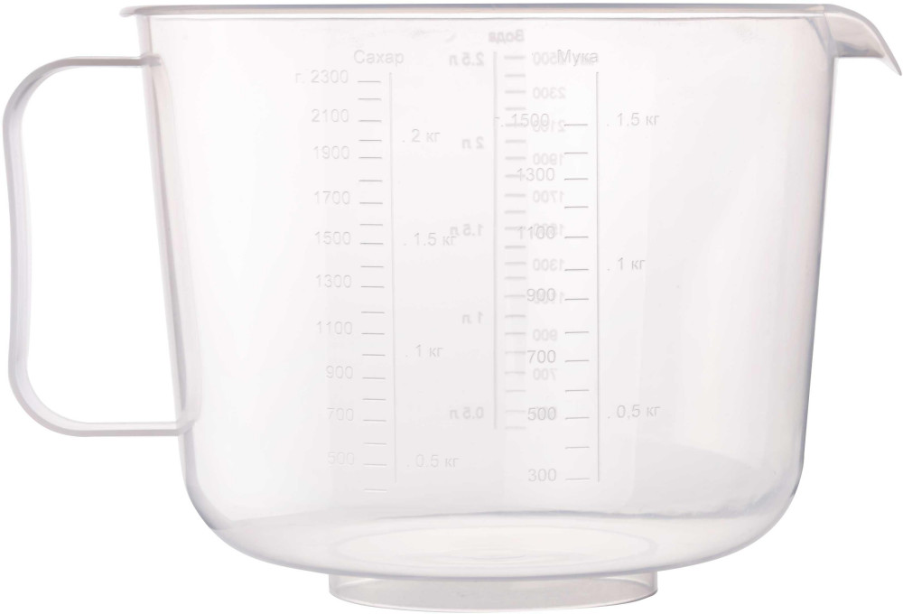 Большая мерная емкость. Подходит для замешивания теста. Единственный минус, действительно слабая ручка. При первом же использовании пошла трещина на самом корпусе емкости.
