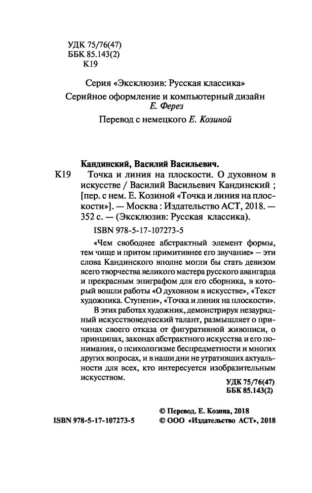 💳 Оплатить за товар можно при получении 🇰🇿 Есть бесплатная доставка по Казахстану от 1 дня 🎁 Копите бонусы с каждой покупки Серия: Эксклюзив: Русская классика ?"Чем свободнее абстрактный элемент формы, тем чище и притом примитивнее его звучание« — эти слова Кандинского вполне могли бы стать девизом всего творчества великого мастера русского авангарда и прекрасным эпиграфом для его сборника, в который вошли работы «О духовном в искусстве», «Текст художника. Ступени», «Точка и линия на плоскости». В этих работах художник, демонстрируя незаурядный искусствоведческий талант, размышляет о причинах своего отказа от фигуративной живописи, о принципах, законах абстрактного искусства и его понимания, о психологизме беспредметности и многих других вопросах, и в наши дни не утративших актуальности для всех, кто интересуется изобразительным искусством. |