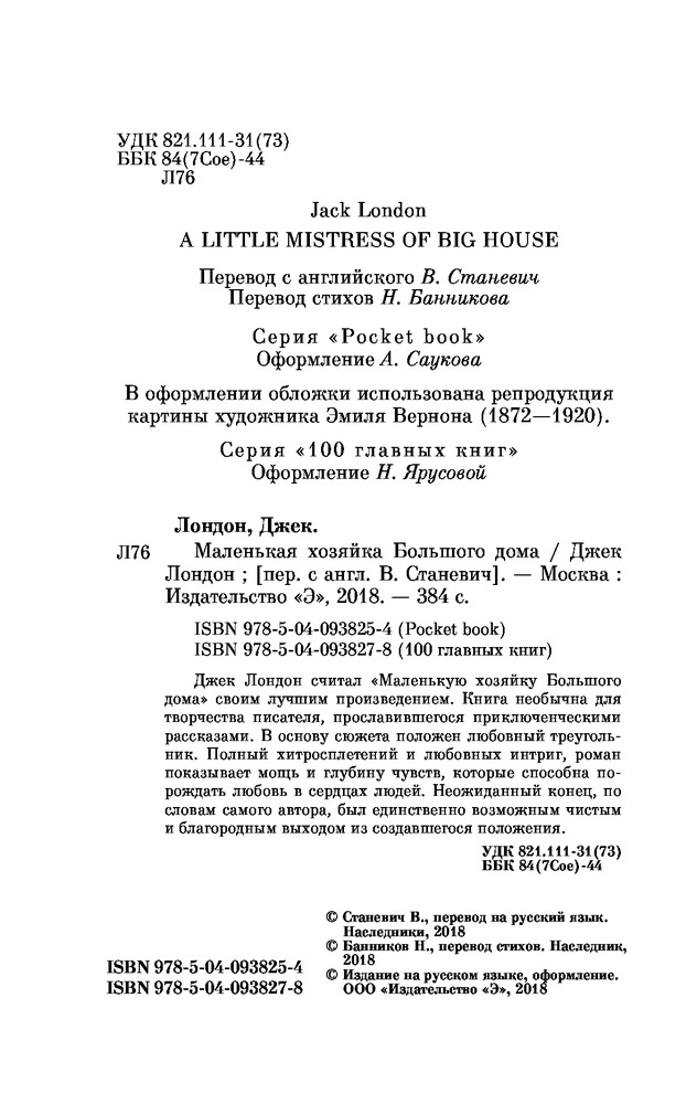 💳 Оплатить за товар можно при получении 🇰🇿 Есть бесплатная доставка по Казахстану от 1 дня 🎁 Копите бонусы с каждой покупки Серия: Pocket Book (обложка) Джек Лондон считал «Маленькую хозяйку большого дома» своим лучшим произведением. Книга необычна для творчества писателя, прославившегося приключенческими рассказами. В основу сюжета положен любовный треугольник. Полный хитросплетений и любовных интриг роман показывает мощь и глубину чувств, которые способна порождать любовь в сердцах людей. Неожиданный конец, по словам самого автора, был единственно возможным чистым и благородным выходом из создавшегося положения. |
