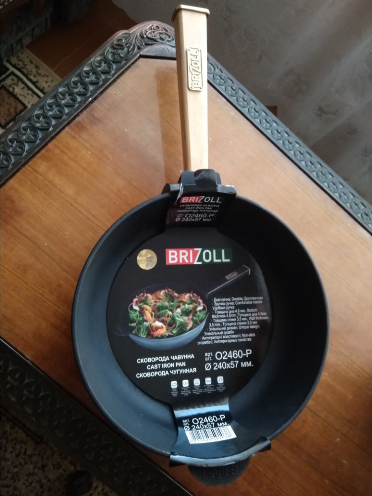 Получила сковороду. Глубокая. Тяжелая (2.185 кг). Упакована в пакет с этикеткой. Завёрнута в бумагу. Деревянная ручка почему-то болтается.... не пойму, как ее можно укрепить. Как обработаю и приготовлю в ней, отзыв дополню. Подошла стеклянная крышка от кастрюли.