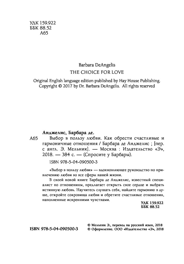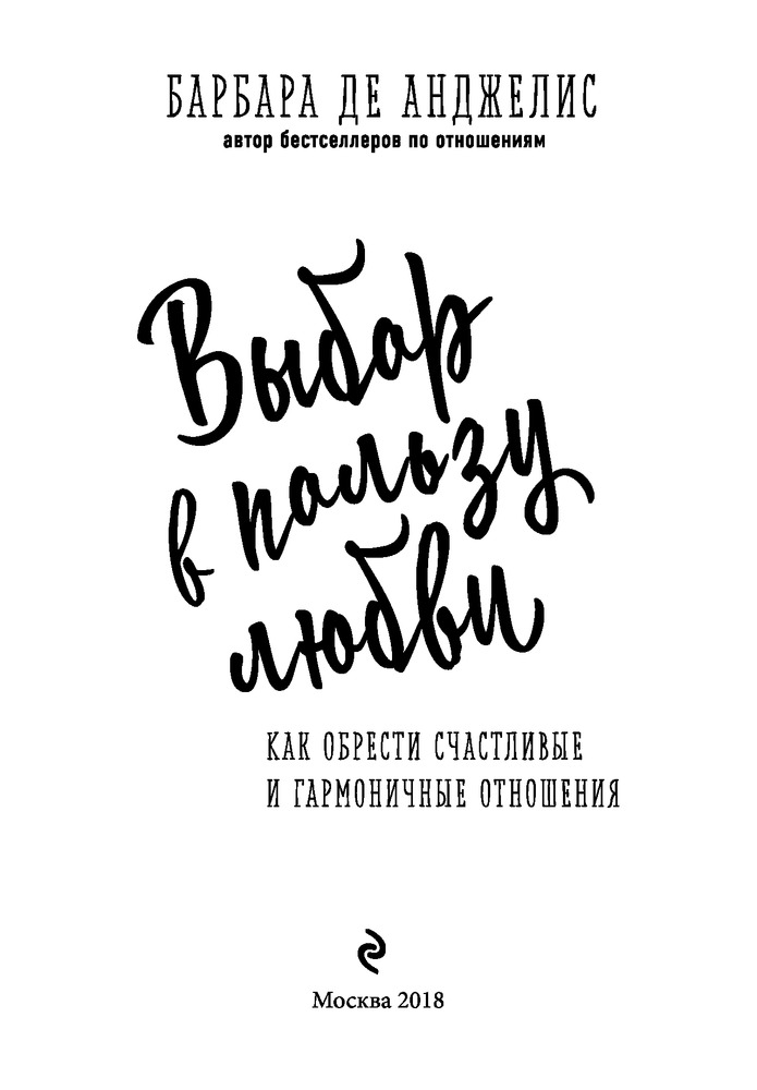 Выбор в пользу любви. Как обрести счастливые и гармоничные отношенияВ данный момент этот товар отсутствует в продаже. Возможно, у нас найдется аналогичный или похожий товар здесь. Серия: Спросите у Барбары «Выбор в пользу любви» — вдохновляющее руководство по привлечению любви во все сферы вашей жизни. В своей новой книге Барбара де Анджелис, известный специалист по отношениям, предлагает открыть свое сердце и выбрать истинную любовь. Научитесь слушать себя, найдите гармонию в душе, откройте сокровища любви и обретите счастливые отношения, наполненные искренними чувствами. |
