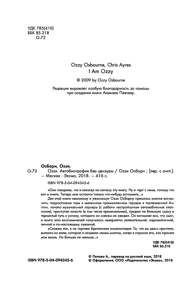 Я - Оззи. Все, что мне удалось вспомнитьВ данный момент этот товар отсутствует в продаже. Возможно, у нас найдется аналогичный или похожий товар здесь. Серия: Подарочные издания. Музыка Они говорили, что я никогда не напишу эту книгу. Ну и черт с ними, потому что вот и книга. Теперь мне остается только что-нибудь вспомнить... Черт. Я вообще ничего не помню. Для этой книги «великому и ужасному» Оззи Осборну пришлось многое вспомнить: подростковые годы в маленьком промышленном городке в послевоенной Англии, начало музыкальной карьеры (с работы настройщиком автомобильных гудков), проступки юности (в том числе криминальные), прорыв на большую сцену и тернистый путь к успеху, которого он совсем не ожидал. Он вспомнил все, что смог, и книга этих воспоминаний получилась невероятно увлекательной, харизматичной, личной и по-настоящему смешной. Скажем так, я не чертова Британская энциклопедия. То, что вы здесь прочтете, вытекло из желе, которое я называю своим мозгом, когда я спросил его, как прошла моя жизнь. Ни больше ни меньше... |