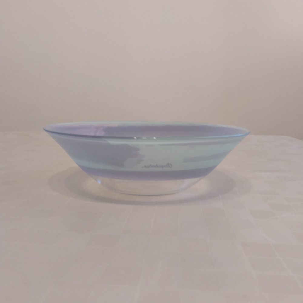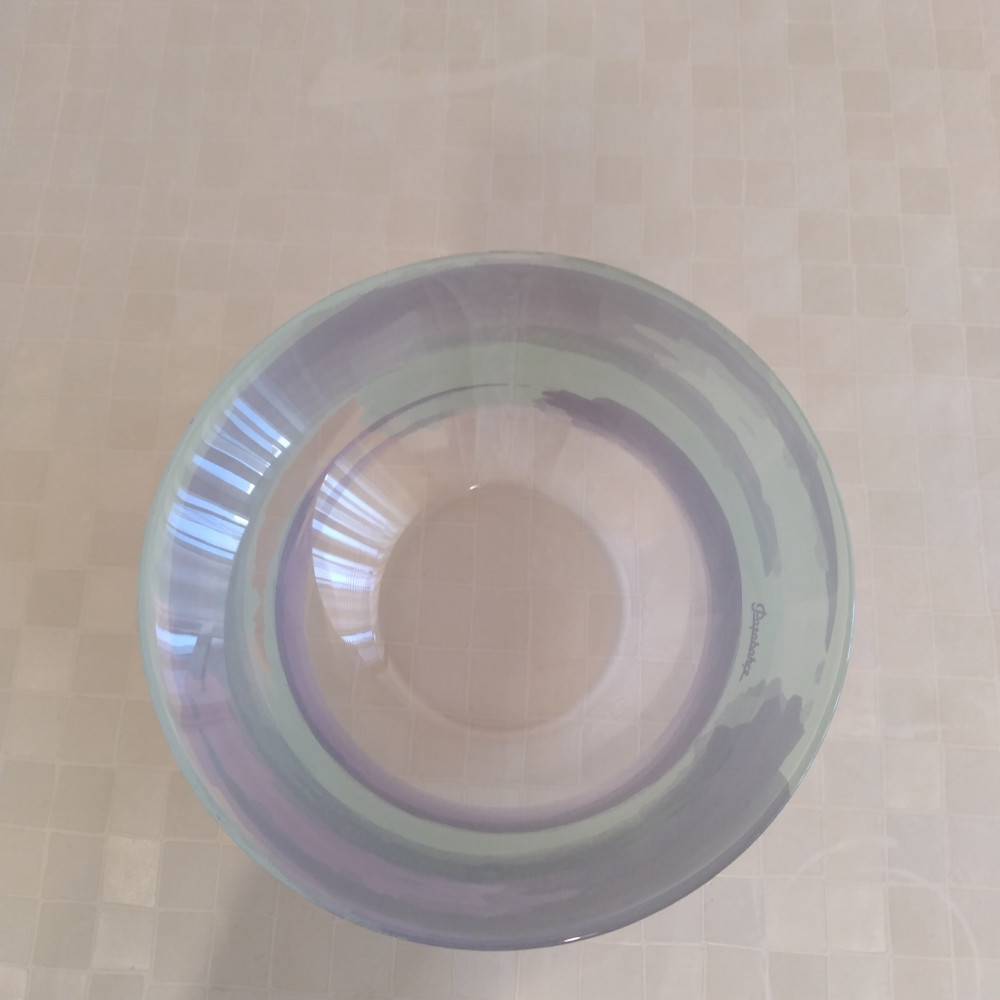 Замечательный салатник небольшого размера. Использую в том числе, как супницу. Диаметр 16.2 см, глубина 4.8 см, диаметр дна 6.5 см, вес 230 грамм. В раскрасе присутствуют гармоничные сочетания зеленых и фиолетовых тональностей. Качество обработки стекла отличное!