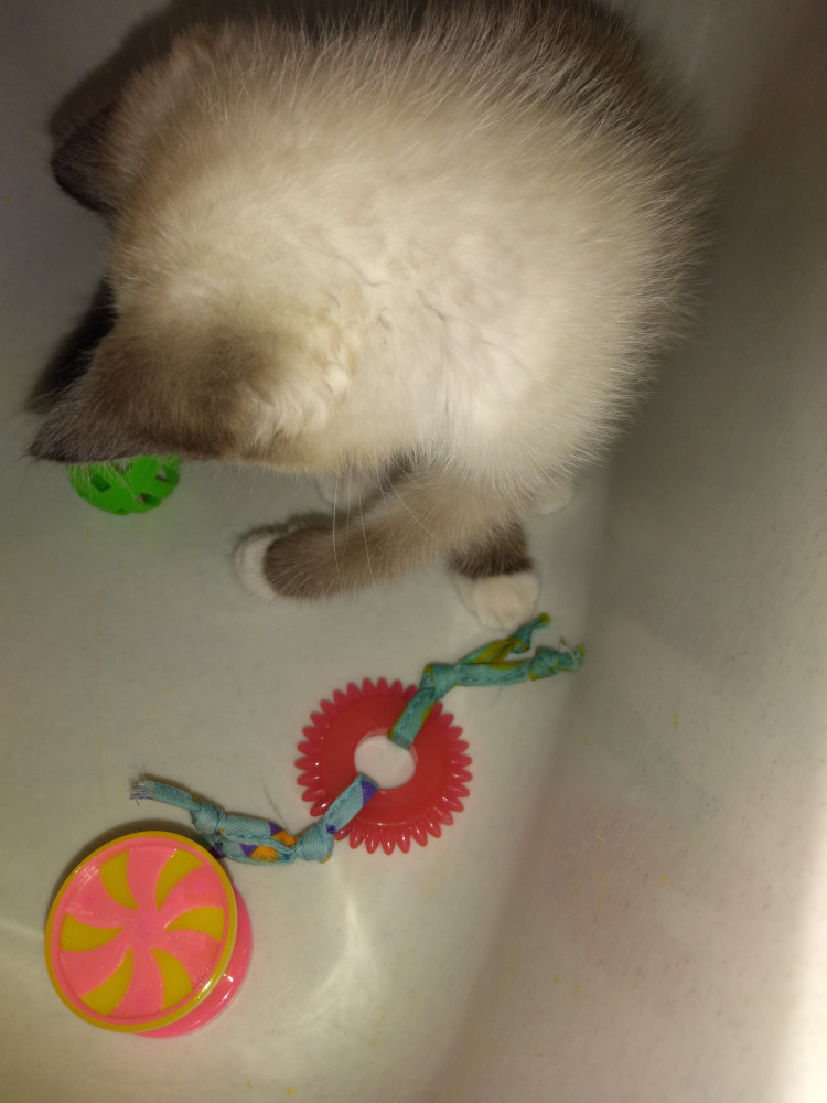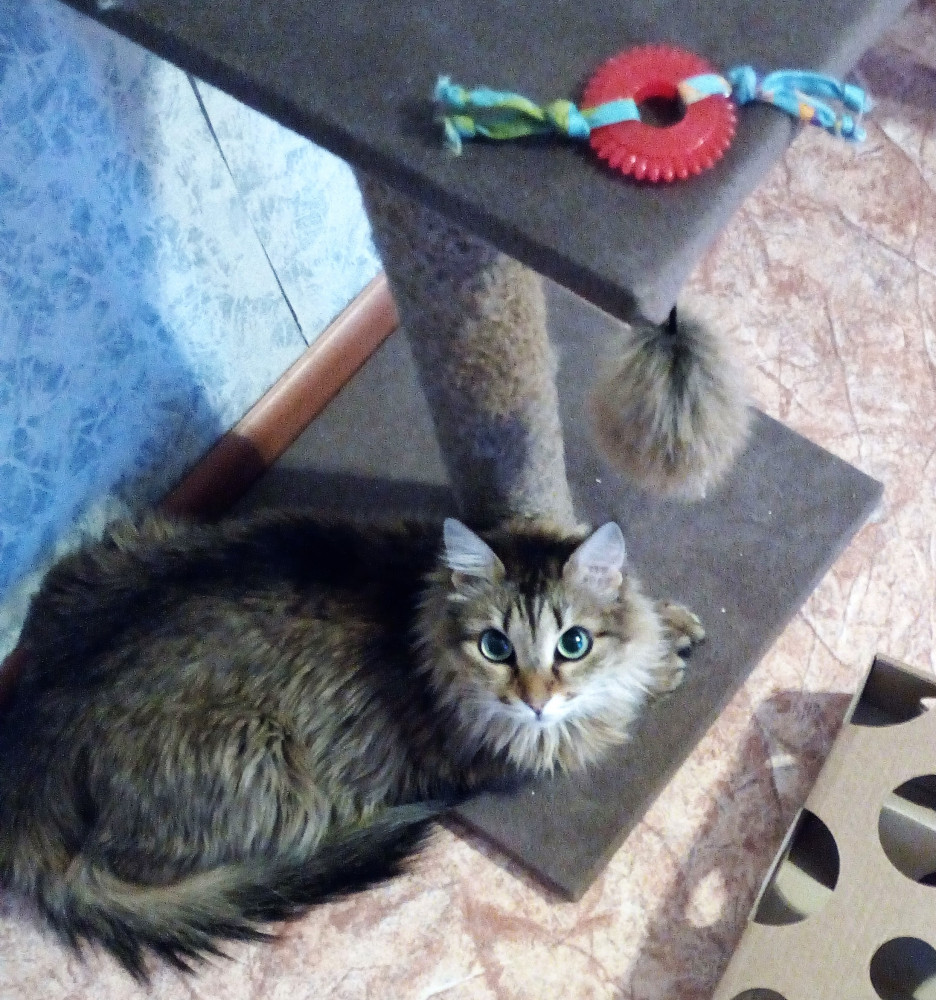 Думала котику понравится грызть колесико, но нет, больше веревки понравились