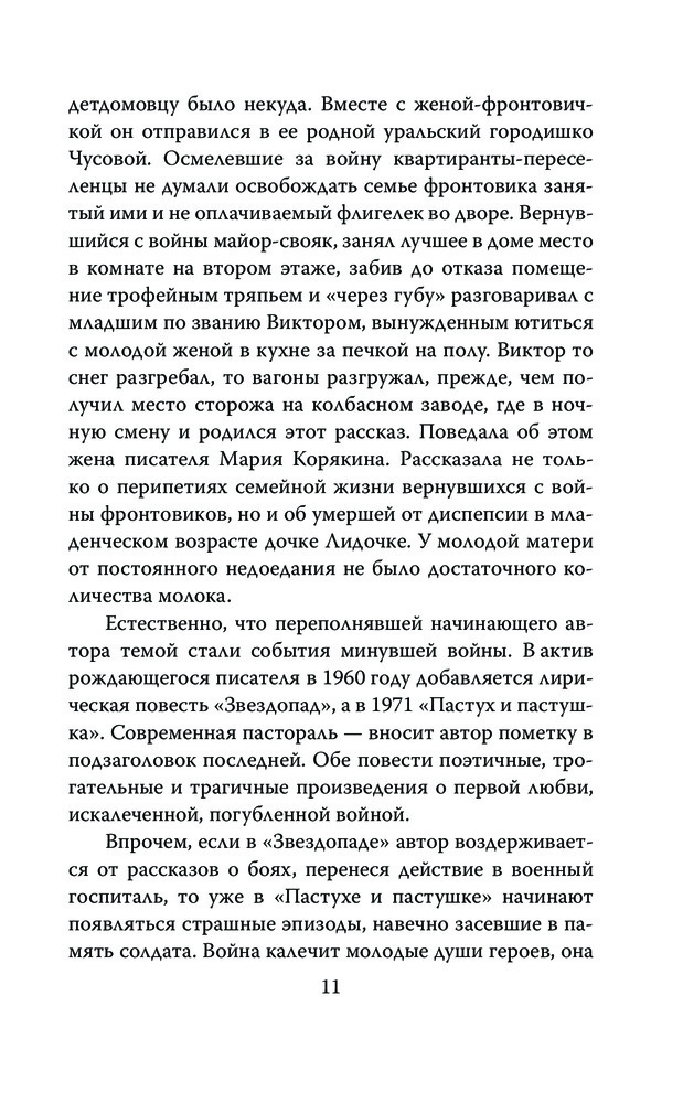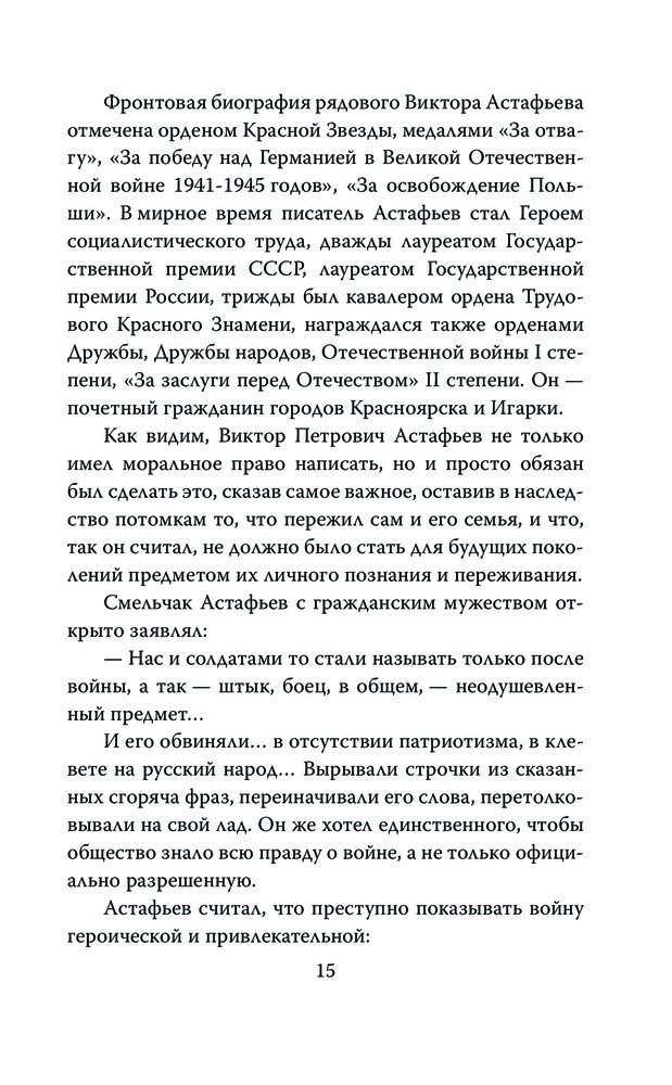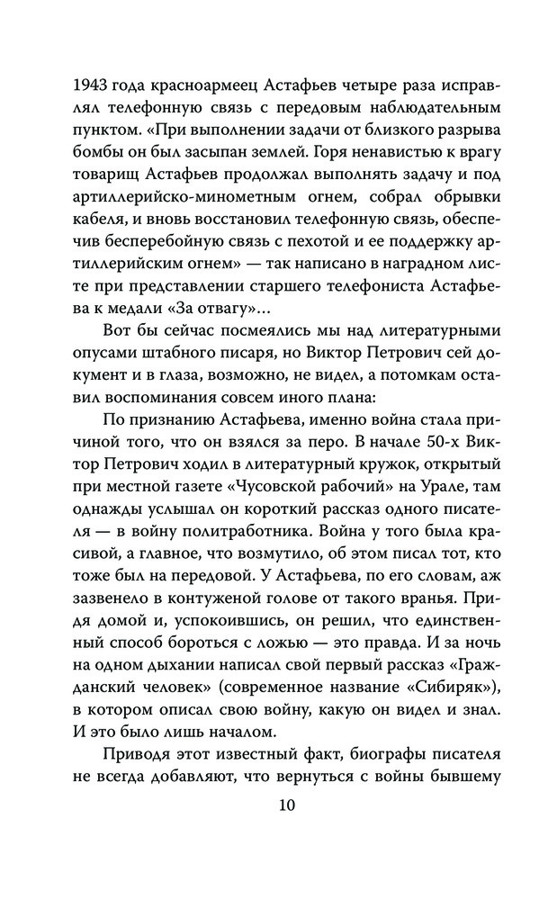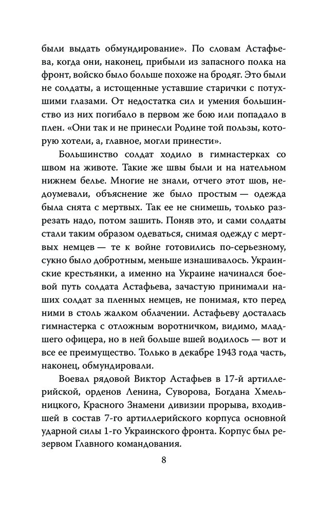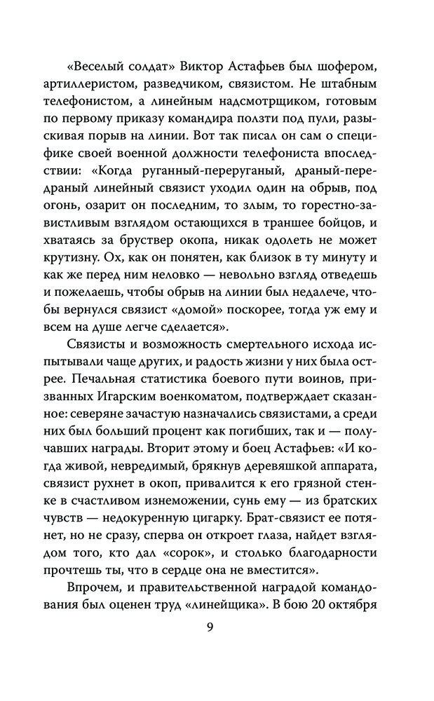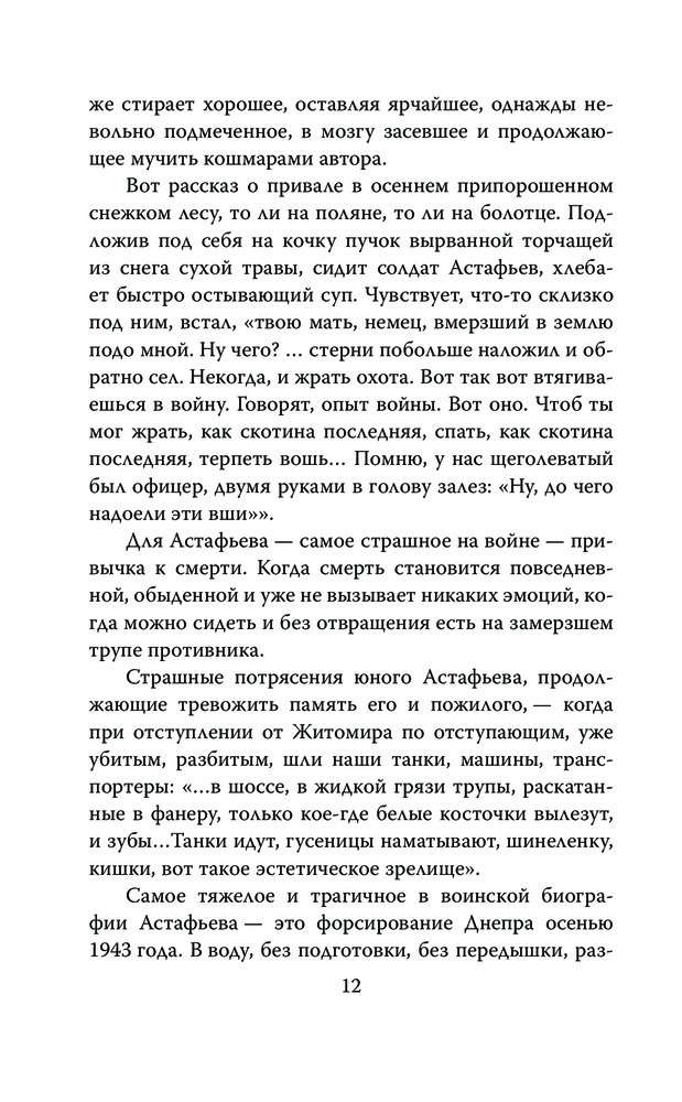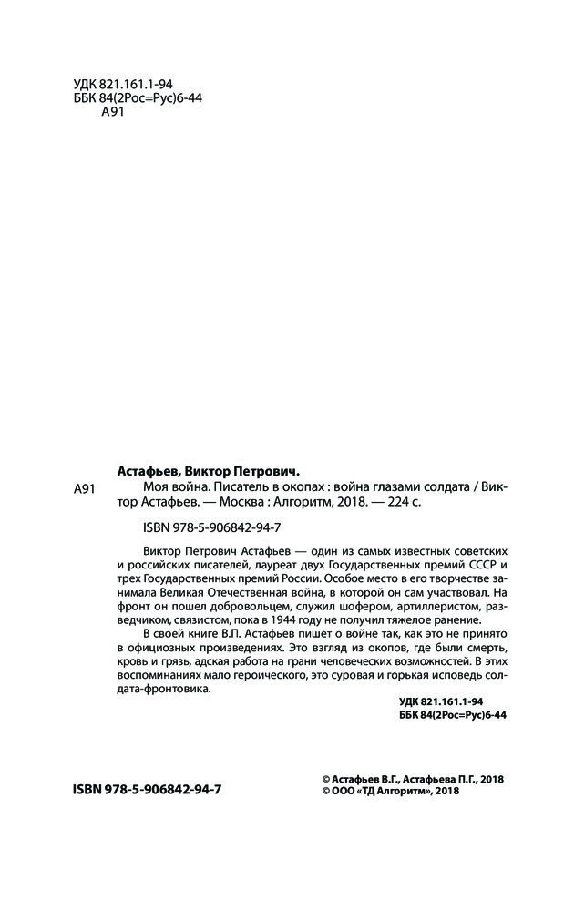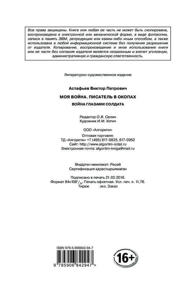 Писатель в окопах. Война глазами солдатаВ данный момент этот товар отсутствует в продаже. Возможно, у нас найдется аналогичный или похожий товар здесь. Серия: Моя война Виктор Петрович Астафьев – один из самых известных советских и российских писателей, лауреат двух Государственных премий СССР и трех Государственных премий России. Особое место в его творчестве занимала Великая Отечественная война, в которой он сам участвовал. На фронт он пошел добровольцем, служил шофером, артиллеристом, разведчиком, связистом, пока в 1944 году не получил тяжелое ранение. |