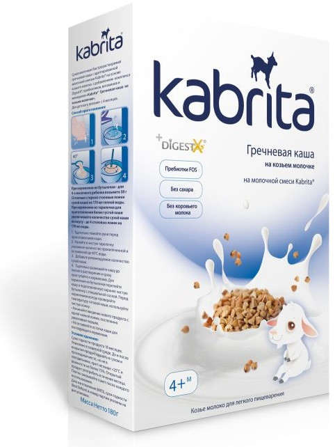Kabrita Каша на козьем молоке «Гречневая»В данный момент этот товар отсутствует в продаже. Возможно, у нас найдется аналогичный или похожий товар здесь. Сухая молочная быстрорастворимая гречневая каша на адаптированной смеси Kabrita на основе козьего молока с добавлением комплекса DigestX®, пребиотиков, витаминов и минералов. Подходит для питания детей в возрасте от 4 месяцев. |